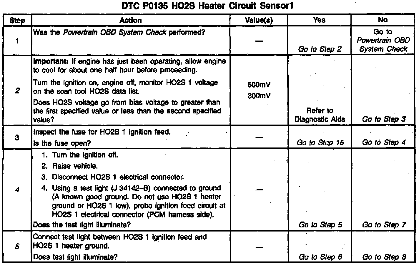 The PCM will run the heater test only after a cold start (determined by engine coolant and intake air temperature at the time of start-up) and only once during an ignition cycle. When the engine is started the PCM will monitor the HO2S voltage. When the HO2S voltage indicates a sufficiently active sensor, the PCM looks at how much time has elapsed since start-up. If the PCM determines that too much time was required for the HO2S 1 to become active, a DTC P0135 will set. The time it should take the HO2S to reach operating temperature is based on the engine coolant temperature at start-up and the average Mass Air Flow since start-up (higher average airflow or higher start-up engine coolant temperature = shorter time to HO2S activity).