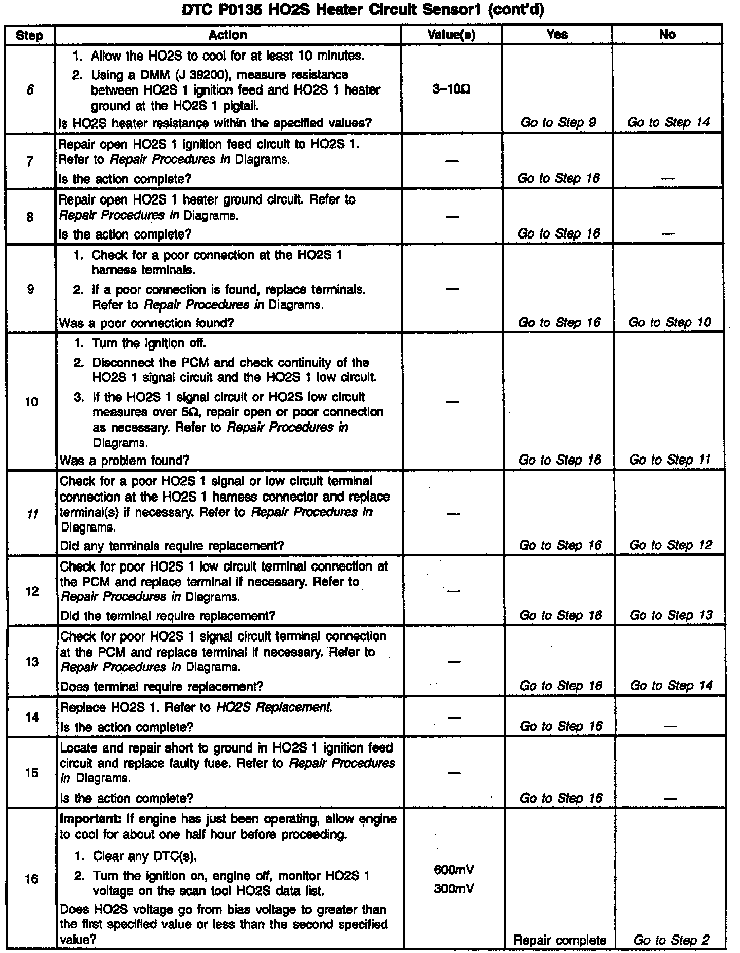 6. Checks for an open or shorted HO2S heater element. The heater element resistance will vary according to HO2S temperature (a hot HO2S heater element will measure a much higher resistance than a HO2S heater element at room temperature). It is important to allow the HO2S to cool before measuring HO2S heater element resistance.