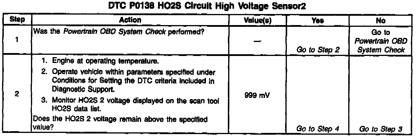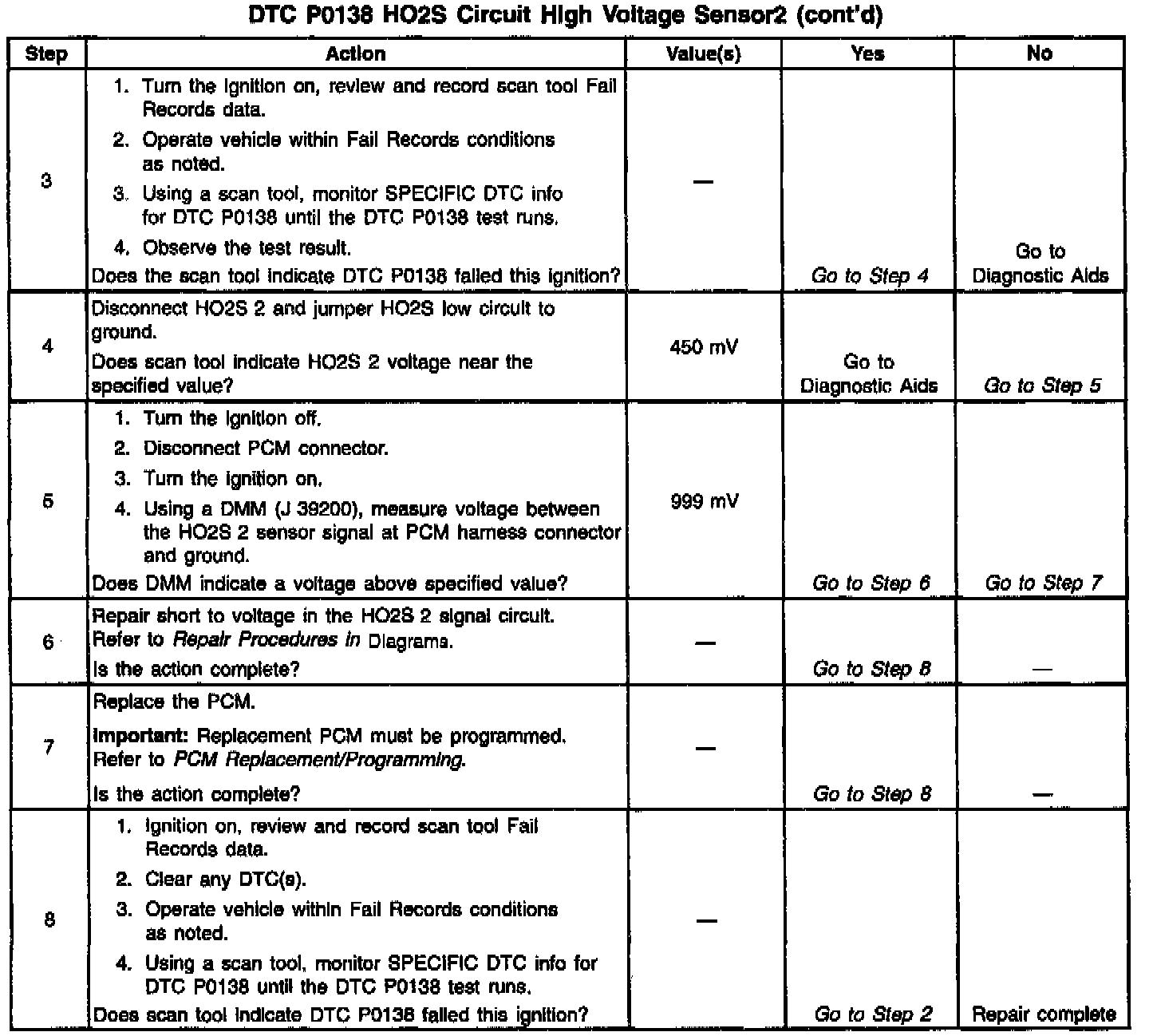 3. DTC P0138 being set during deceleration fuel mode operation may indicate a condition described in the Diagnostic Aids above. If the DTC P0138 test passes while the Fail Records conditions are being duplicated, an intermittent condition is indicated. Reviewing the Fail Records vehicle mileage since the diagnostic test last failed may help determine how often the condition that caused the DTC to be set occurs. This may assist in diagnosing the condition.