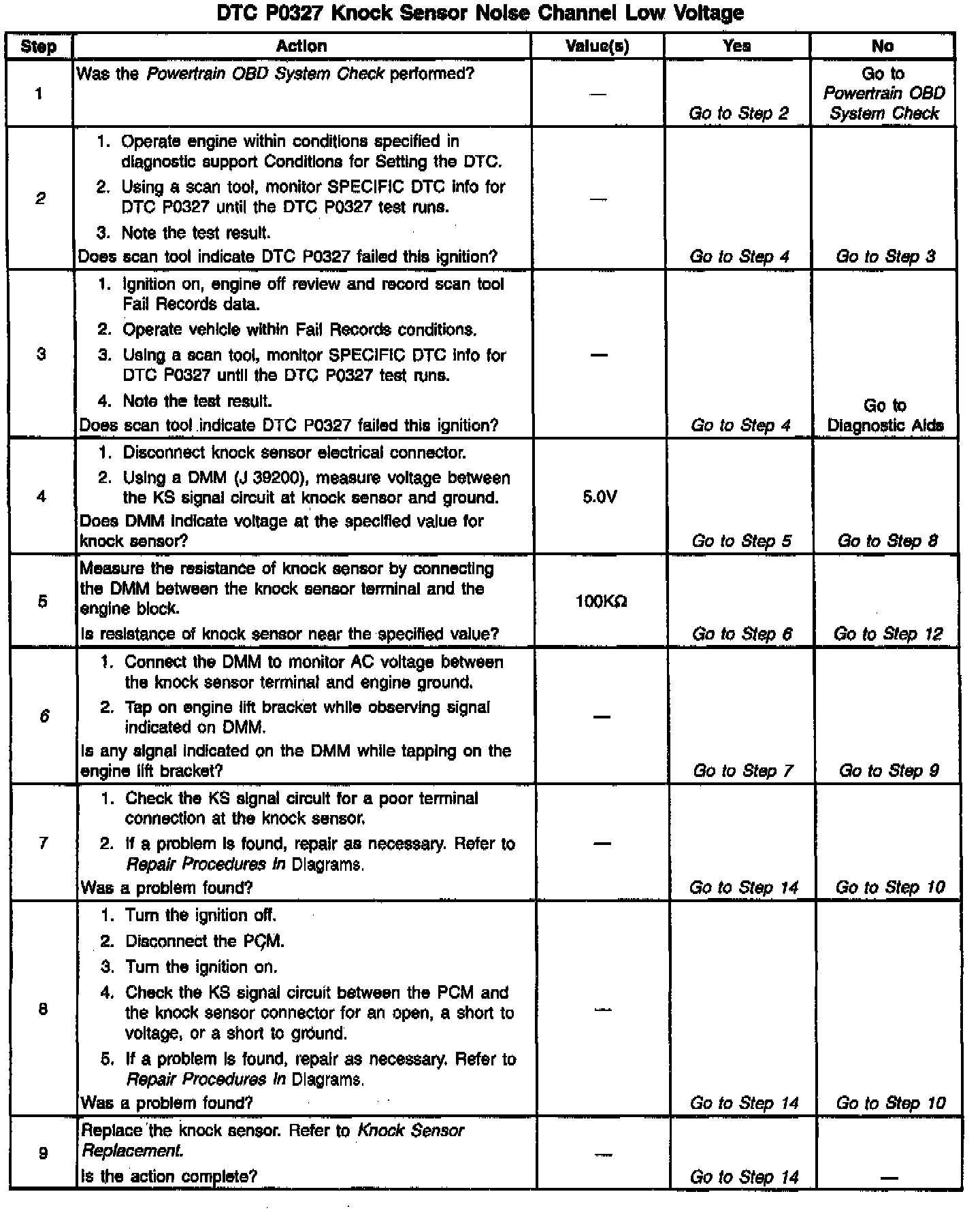 The PCM determines whether knock is occurring by comparing the signal level on the KS circuit with the voltage level on the noise channel. The noise channel allows the PCM to reject any false knock signal by indicating the amount of normal engine mechanical noise present. Normal engine noise varies depending on engine speed and load. When the PCM determines that an abnormally high noise channel voltage level is being experienced, a DTC P0326 will set.