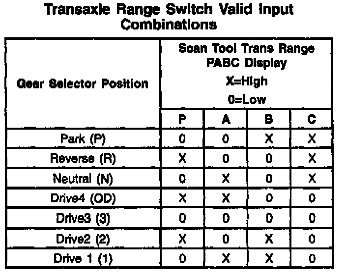 The combination of the four Transaxle range input states determine the PCM commanded shift pattern. The input voltage level at the PCM is high (B+) when the Transaxle range switch is open and low when the switch is closed to ground. The state of each input is represented on the scan tool as X=high voltage level, 0=low voltage level. The four parameters represent transaxle range switch Parity, A, B, and C inputs respectively.