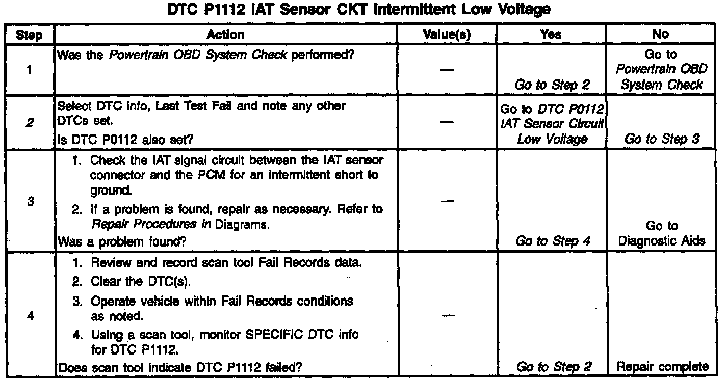3. If DTC P1112 can be repeated only by duplicating the Fail Records conditions, refer to Temperature vs Resistance. The table may be used to test the 'IAT sensor at various temperatures to evaluate the possibility of a shifted sensor that may be shorted above or below a certain temperature. It this is the case, replace the IAT sensor.