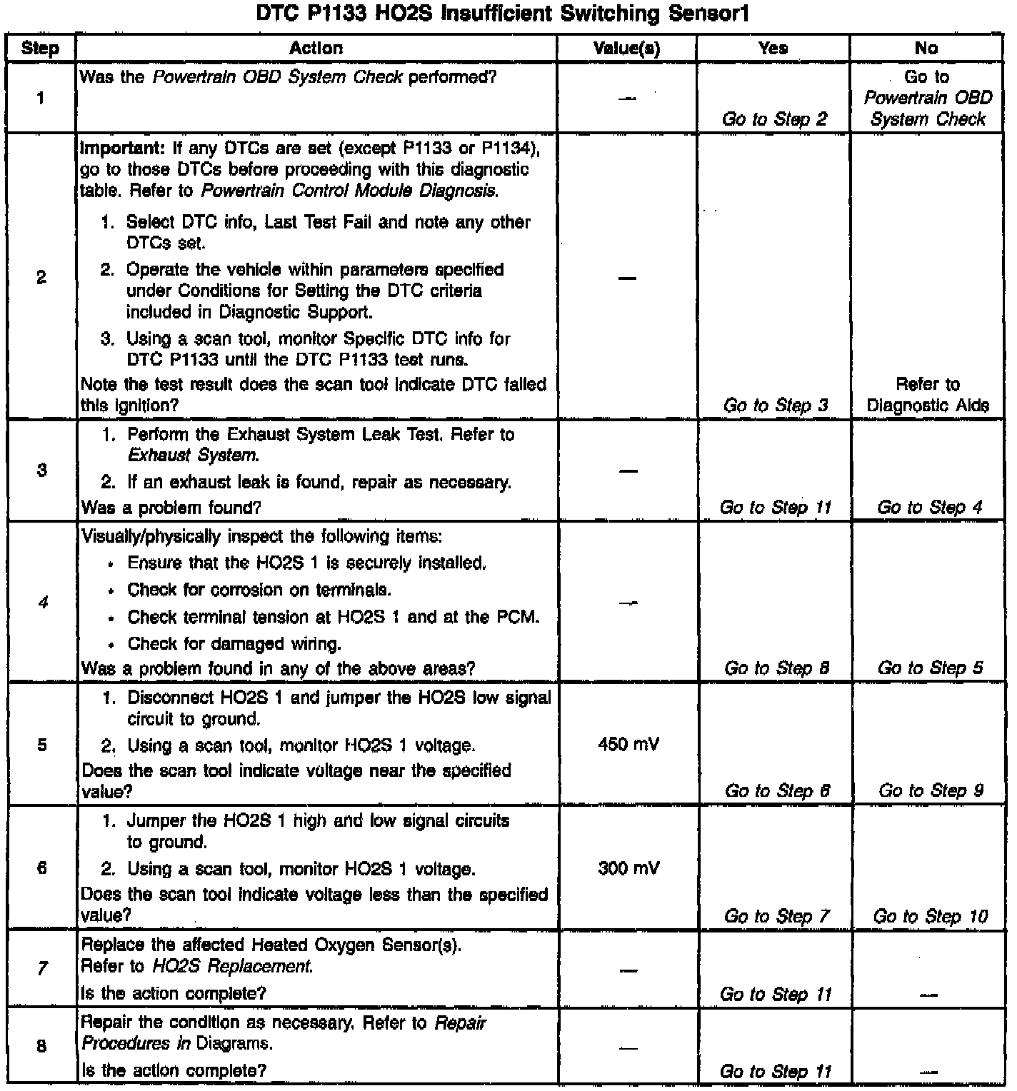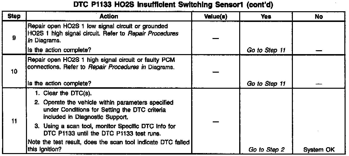 A malfunction in the HO2S heater ignition feed or ground circuit may cause a DTC P1133 to set. Check HO2S heater circuitry for intermittent faults or poor connections. If connections and wiring are OK and DTC P1133 continues to set, replace the HO2S 1.