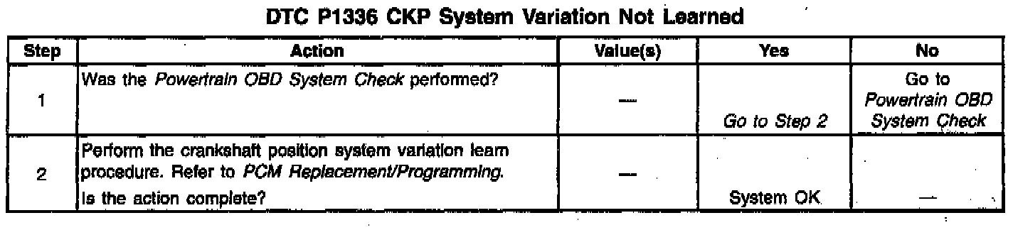 The crankshaft position system variation values are stored in the PCM non-volatile memory after the crankshaft position system variation learn procedure has been performed. DTC P1336 set indicates that the crankshaft position system variation values have not been stored in the PCM and the crankshaft position system variation learn procedure must be performed. The learn procedure is required after the following service procedures have been performed, regardless of whether or not DTC P1336 is set: