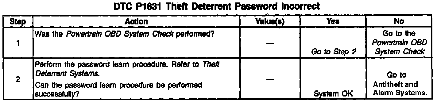 The PCM controls fuel injector and starter operation based on a vehicle theft deterrent password from the Body Control Module (BCM). When the ignition is first turned on, the BCM sends a programmed password to the PCM. The PCM acknowledges the password and responds to the BCM that normal fuel injector operation will continue. If the PCM detects an incorrect password (Theft Deterrent system failure or attempted vehicle theft), DTC 1631 will set. The engine will not start as long as the condition is present.