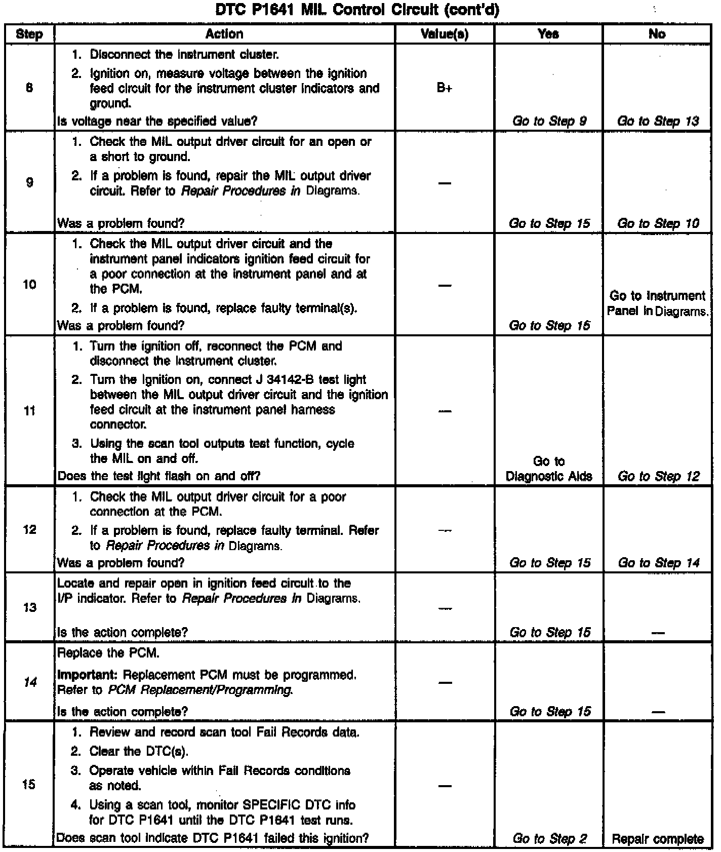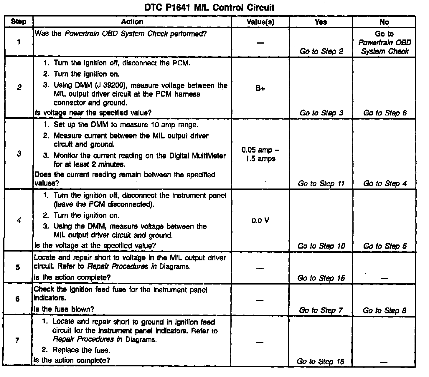 Unlike the Quad Driver Modules (QDMs) used in prior model years, ODMs have the capability of diagnosing each Output circuit individually. DTC P1641 set indicates an improper voltage level has been detected on ODM A output 1, which controls the Malfunction Indicator Lamp (MIL).