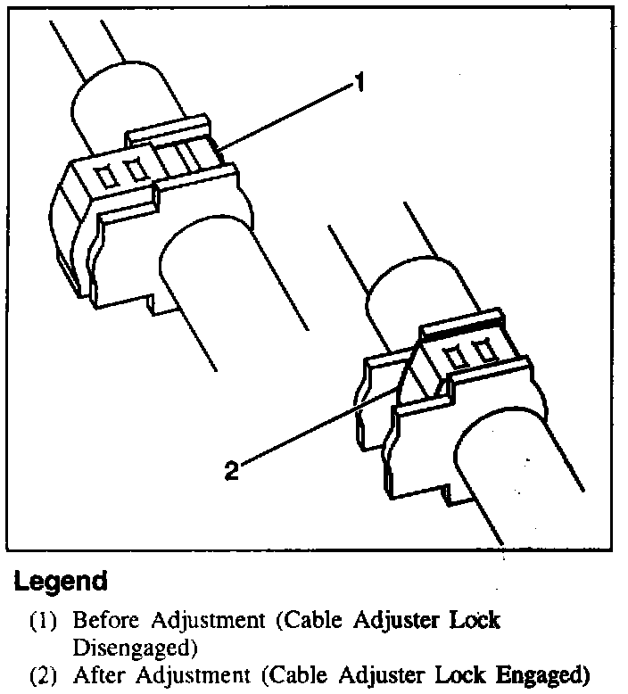 1. Disengage the cable adjuster lock by spreading the adjuster lock tabs and pulling the adjuster lock out.
