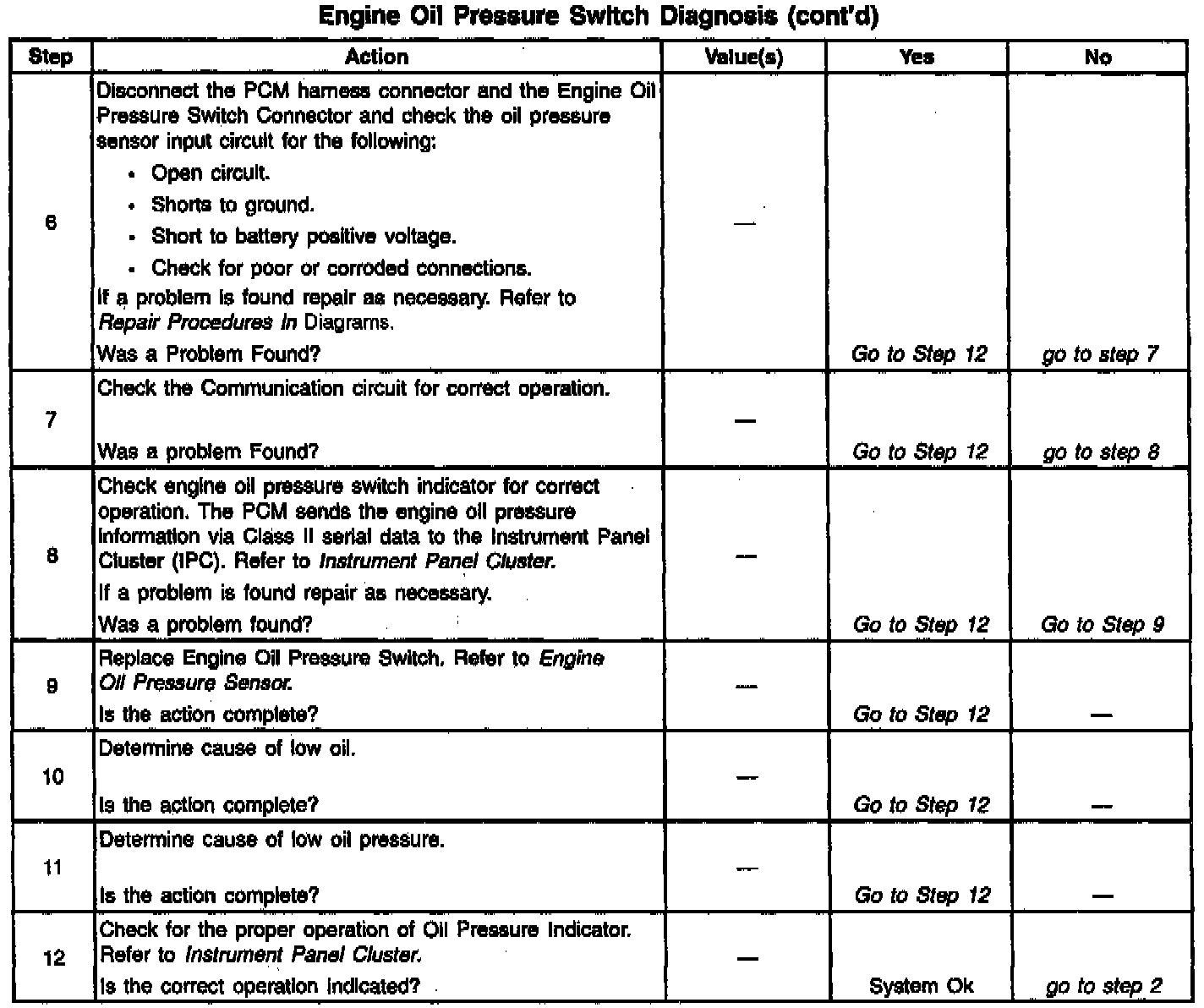 The PCM applies battery voltage through a pull up resistor to the Engine Oil Pressure Switch circuit. The PCM monitors the applied voltage on the Engine Oil Pressure Switch circuit. If the ignition switch is turned ON with the engine not running or engine oil pressure is below 35 kPa (5 psi), the Engine Oil Pressure switch grounds the PCM voltage input. The PCM sends the engine oil pressure information via Class II serial data to the Instrument Panel Cluster (IPC). The IPC controls the Engine Oil Pressure Indicator.