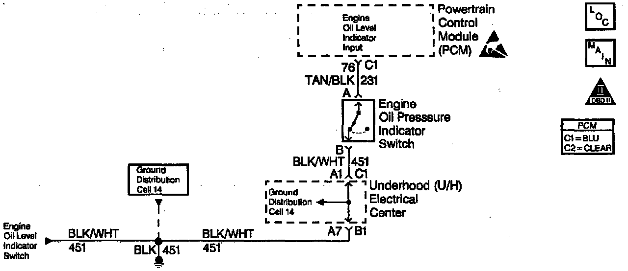 ^ Damaged harness. Inspect the wiring harness for damage. If the harness appears to be OK, disconnect the Engine Oil Pressure switch, turn the ignition on and observe a DMM connected between the Engine Oil Pressure switch connector terminals while moving wiring harnesses related to the Engine Oil Pressure Switch circuit. A change in voltage will indicate the location of the fault.