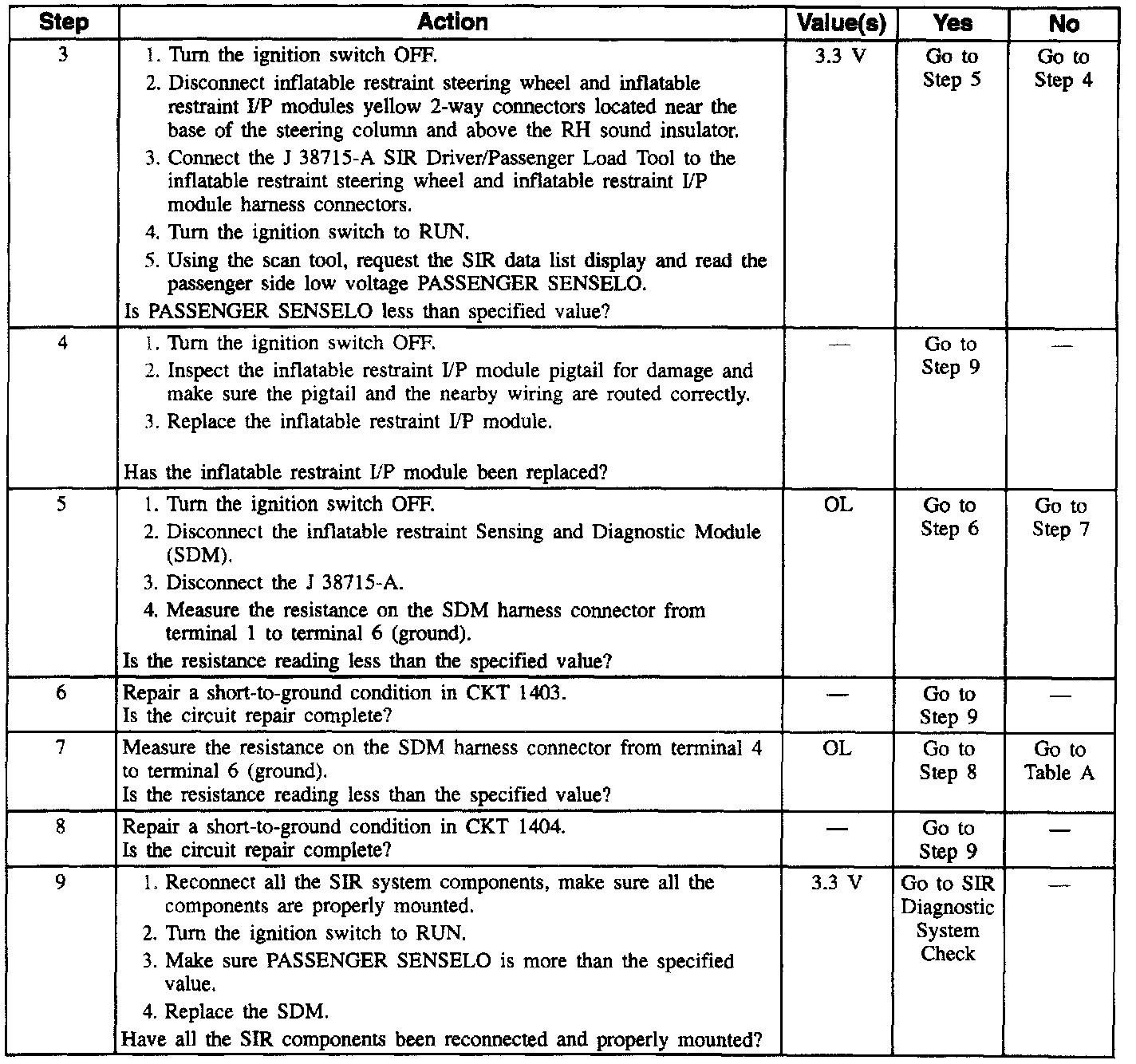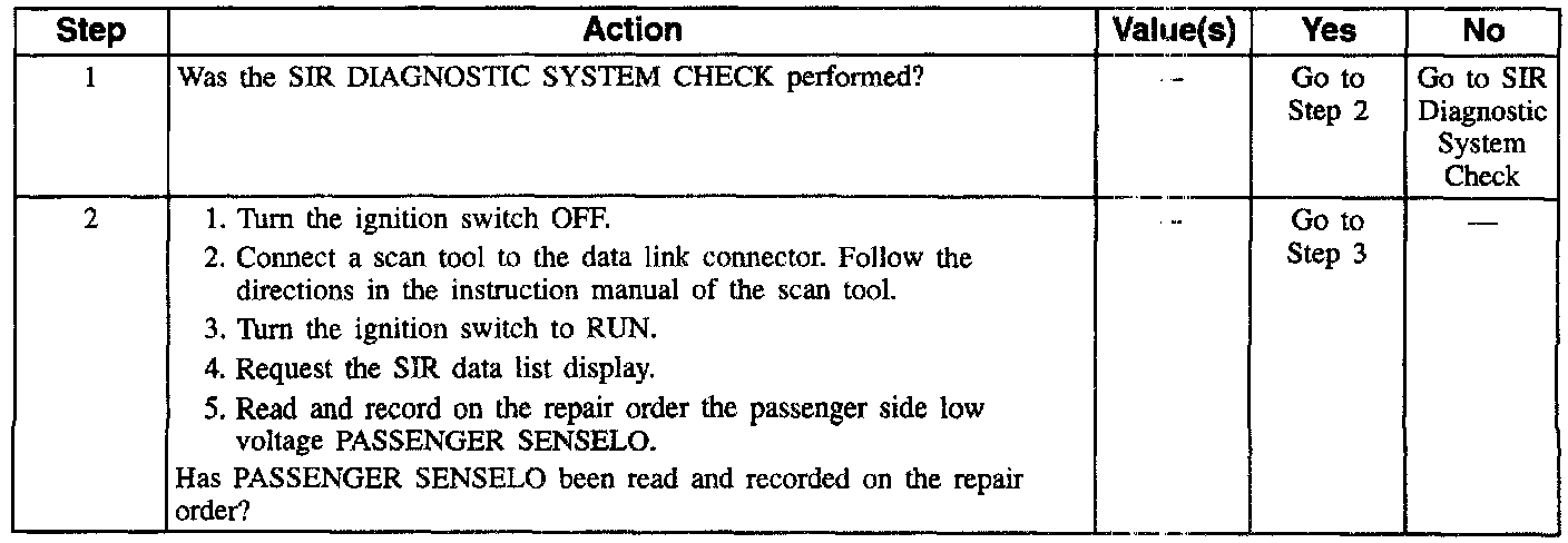 A short-to-ground in the inflatable restraint I/P module circuit can cause an intermittent condition. Moving wires while monitoring PASSENGER SENSELO may help locate the fault. A DTC B1018 would be accompanied by DTC B1071. Inspect CKTs 1403 and 1404 carefully for cutting or chafing. Wiring pigtail damage requires replacement of the inflatable restraint I/P module. A careful inspection of the circuits and components indicated on the DTC B1018 Table is essential in order to prevent damage to the replacement SDM. The diagnostic table directs the technician to note the entry value of PASSENGER SENSELO. Comparing the value of PASSENGER SENSELO can be helpful in determining if an intermittent condition exists.
