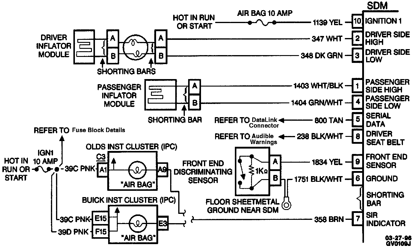 When you first turn the ignition switch to the RUN position, the inflatable restraint Sensing and Diagnostic Module (SDM) performs tests to diagnose critical malfunctions within itself. Upon passing these tests IGNITION 1, 23 VLR and deployment loop voltages are measured to make sure they are within their respective normal voltage ranges. The SDM monitors the voltages at DRIVER SIDE LOW terminal 3 and PASSENGER SIDE LOW terminal 4 to detect shorts to ground in the inflator module circuits. The service wait time is 10 minutes. Service and Repair