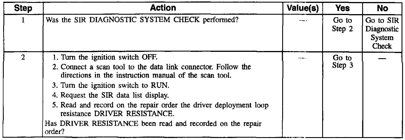 When you first turn the ignition switch to the RUN position, the inflatable restraint Sensing and Diagnostic Module (SDM) performs tests to diagnose critical malfunctions within itself. Next the SDM measures IGNITION 1 and the deployment loop voltages to make sure they are within their respective normal voltage ranges. Then the SDM proceeds with the RESISTANCE MEASUREMENT test. During one portion of the RESISTANCE MEASUREMENT test, the SDM does the following: