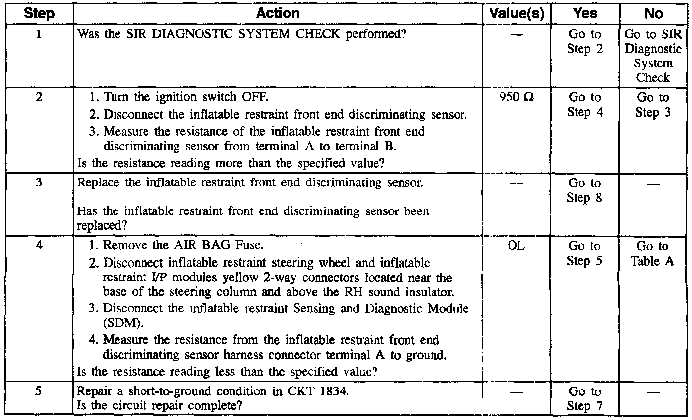 When you first turn the ignition switch to the RUN position, the inflatable restraint Sensing and Diagnostic Module (SDM) performs tests to diagnose critical malfunctions within itself. Next the SDM measures IGNITION 1, 23 VLR and the deployment loop voltages to make sure they are within their respective normal voltage ranges. Then the SDM proceeds to CONTINUOUS MONITORING. The SDM contains a resistor network connected to 5 volts, ground, and to the SDM sensor signal terminal 9. The 1.0 K OHM resistor in the inflatable restraint front end discriminating sensor parallel to the normally open switch provides a parallel path to ground. This causes a specified percentage of voltage to appear at the SDM sensor feed input. The SDM monitors this voltage to detect shorts to ground or a closed discriminating sensor.