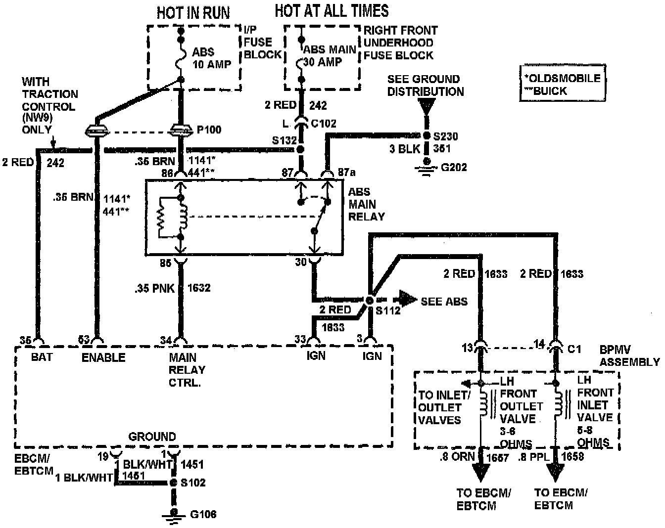 When the ignition is first turned to RUN, the Electronic Brake/Traction Control Module (EBCM/EBTCM) goes through a self-check lasting 2-4 seconds. During this test the EBCM/EBTCM grounds terminal 34, energizing the main relay. Once the self-check is completed the main relay remains energized. This delivers battery voltage to both the EBCM/EBTCM and Brake Pressure Modulator Valve (BPMV) during vehicle operation. The constant voltage supply allows the vehicle to enter ABS mode without delay. The main relay is de-energized whenever the amber ANTILOCK indicator illuminates due to a system malfunction, causing the ABS system to shut down.