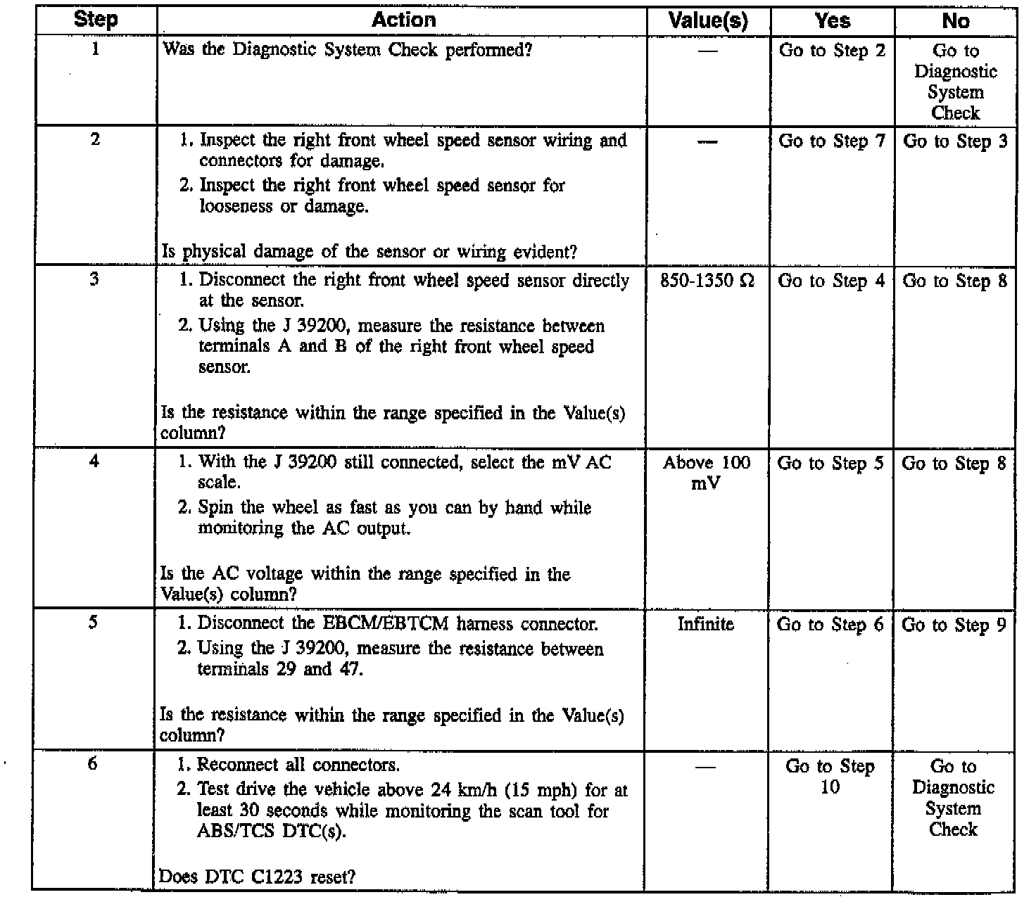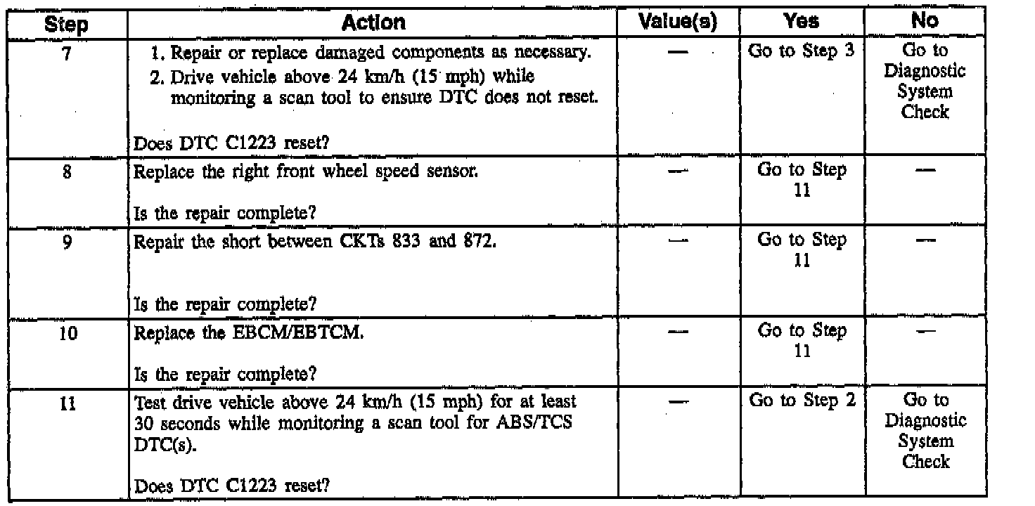 DTC C1223 sets when the EBCM/EBTCM does not see any wheel speed sensor signal, but determines continuity exists in the circuit. This is caused by a dislodged wheel speed sensor, missing toothed sensor ring (front) or defective hub and bearing assembly (rear).
