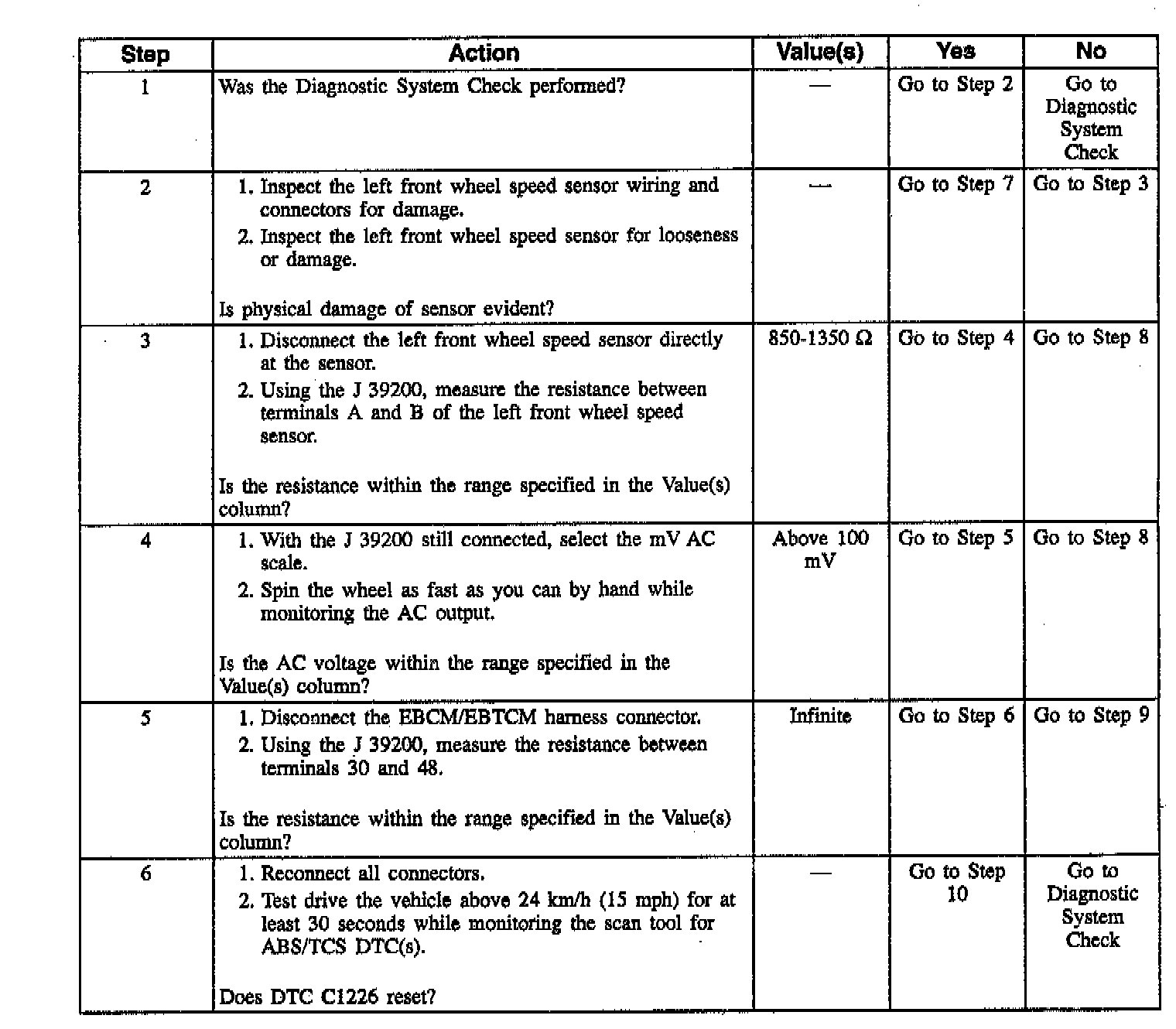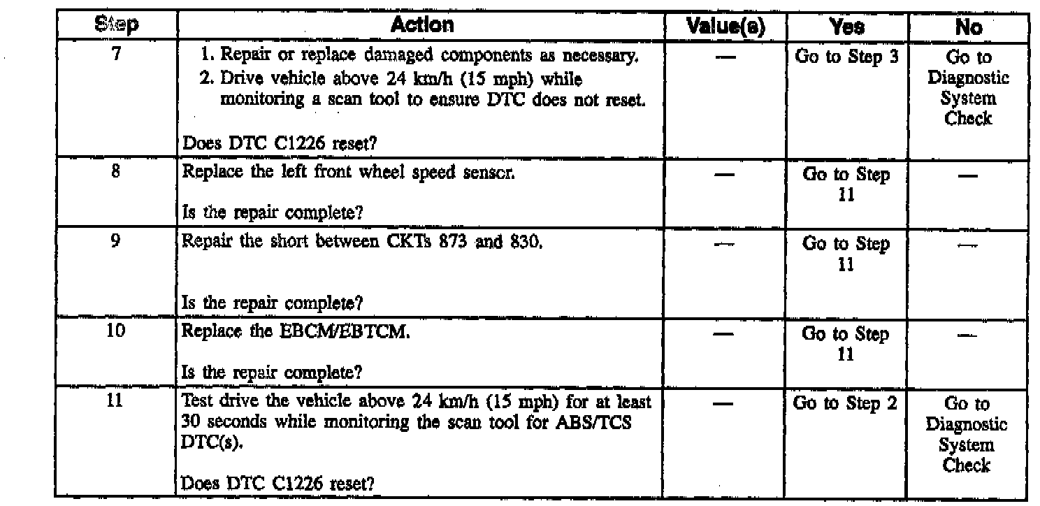 DTC C1226 also sets when the EBCM/EBTCM determines a wheel speed signal is erratic. A wheel speed signal indicating that a wheel is accelerating or decelerating faster than physically possible is an example of an erratic signal. An intermittent open or short to ground in a wheel speed sensor could also cause the EBCM/EBTCM to set a DTC.