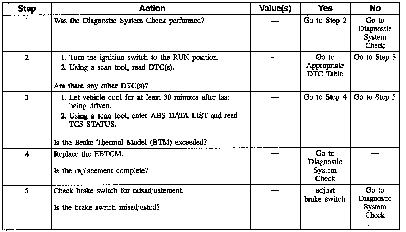 A malfunction DTC is stored. The EBTCM illuminates the TRACTION OFF indicator and TCS is disabled as long as both driven wheel brake rotor temperatures are above the estimated figure. If the rotor temperatures go below the estimated figure, then the TRACTION OFF indicator will be turned OFF.
