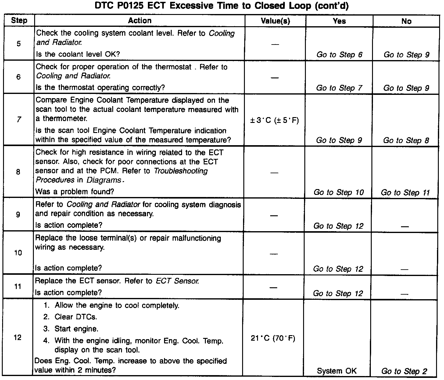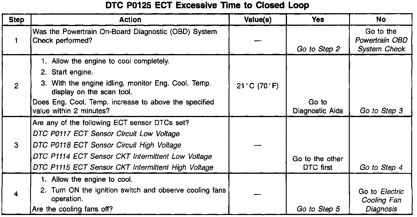 ^ DTC P0125 set indicates a skewed ECT sensor. Comparing the engine coolant temperature displayed on a scan tool with actual coolant temperature measured with a thermometer may isolate this condition. If the displayed engine coolant temperature is not close to the actual coolant temperature, replace the ECT sensor.