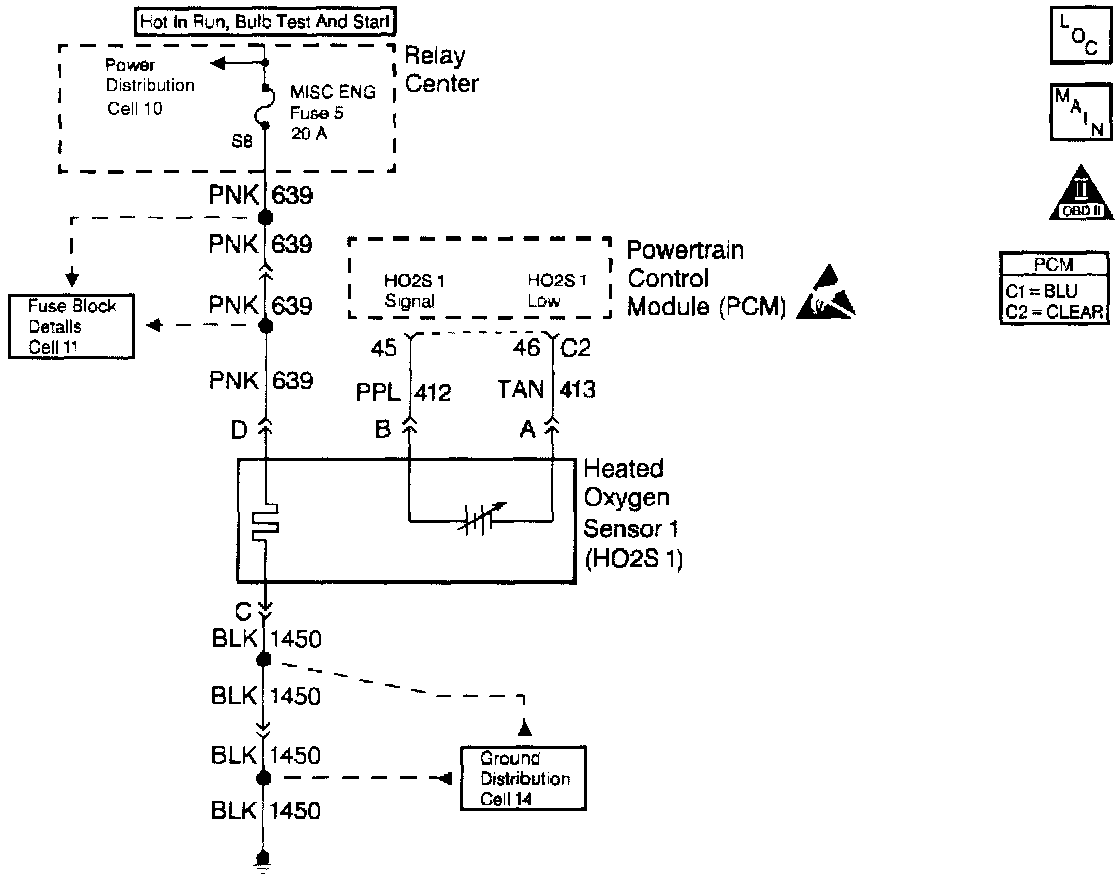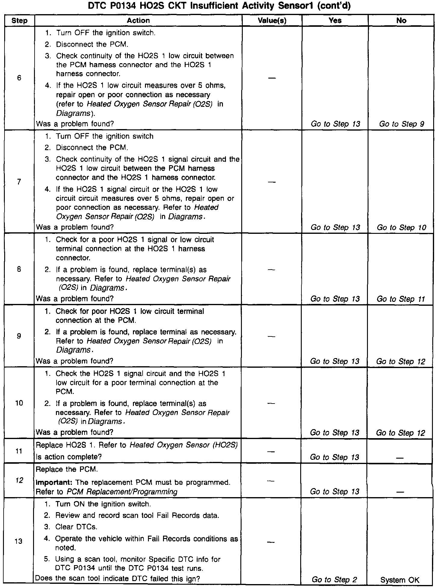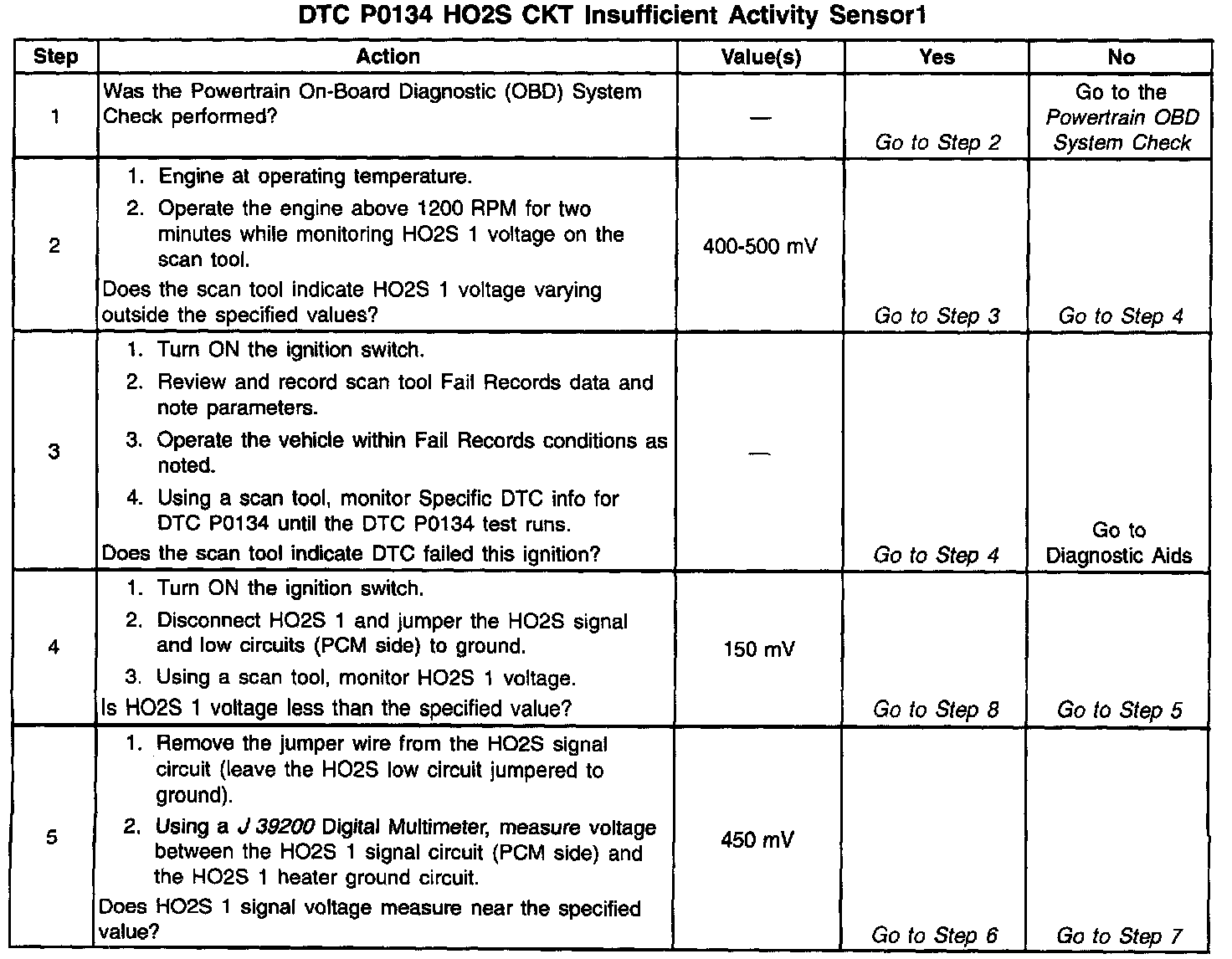 The PCM supplies a bias voltage of about 450 mV between the HO2S signal and low circuits. When measured with a 10 megohm digital voltmeter, this may display as low as 320 mV. The oxygen sensor varies the voltage within a range of about 1000 mV when the exhaust is rich, down through about 10 mV when exhaust is lean. The PCM constantly monitors the HO2S signal during closed loop operation and compensates for a rich or lean condition by decreasing or increasing injector pulse width as necessary. If the HO2S 1 voltage remains at or near the 450 mV bias for an extended period of time, DTC P0134 will be set, indicating an open sensor signal or sensor low circuit.