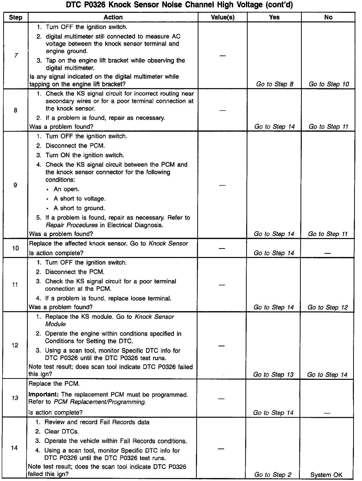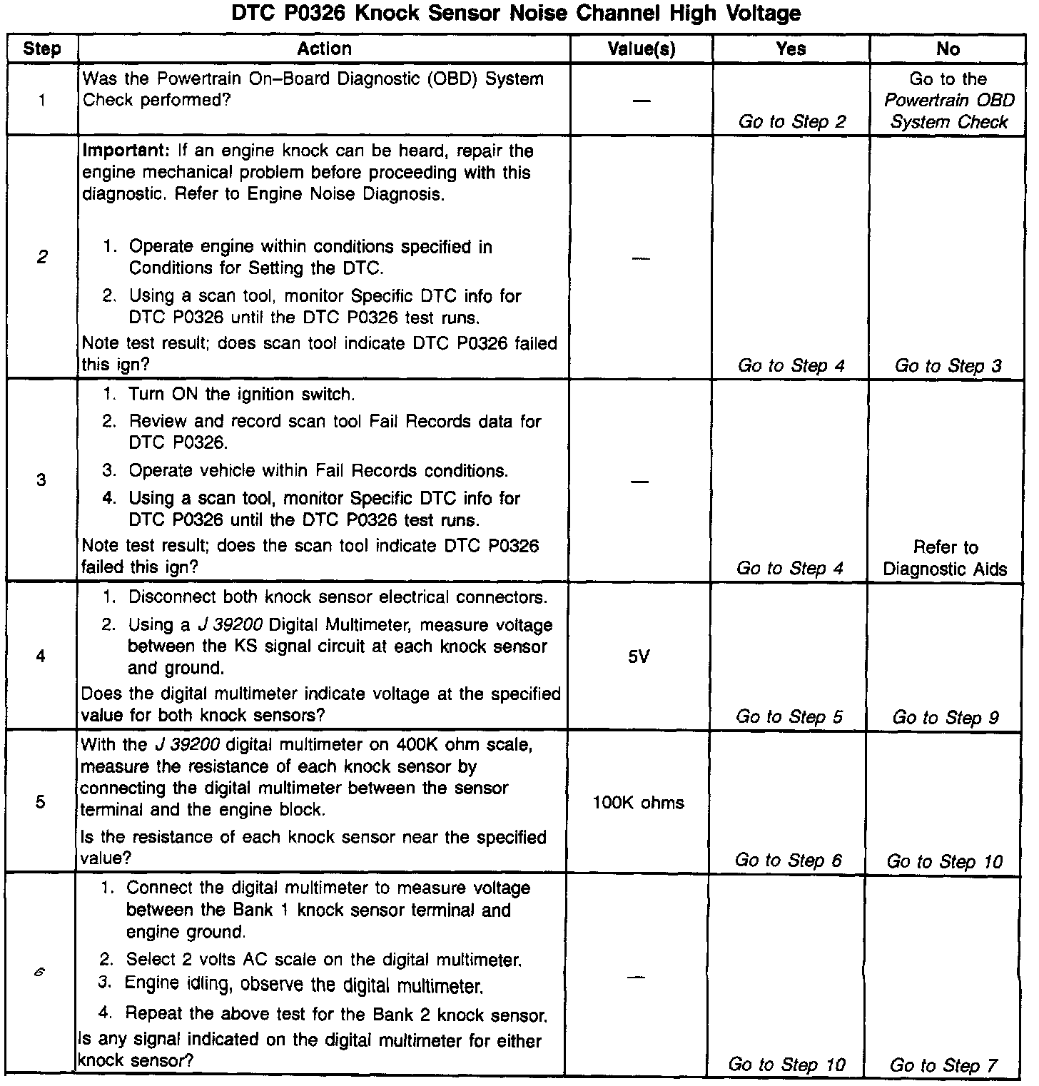 The PCM determines whether the knock sensors and related wiring are operating properly by monitoring the voltage level on the noise channel. The noise channel allows the PCM to diagnose the KS system by allowing the PCM to learn the amount of normal engine mechanical noise present. Normal engine noise varies depending on engine speed and load. When the PCM determines that an abnormally high noise channel voltage level is being experienced, a DTC P0326 will set.