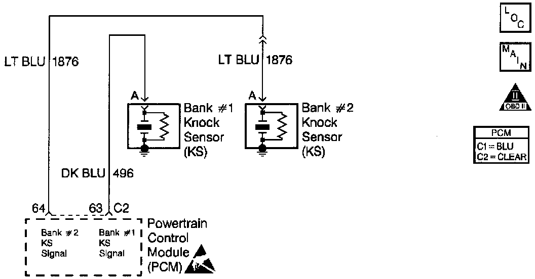 The knock sensors are used to detect engine detonation, allowing the PCM to retard Ignition Control (IC) spark timing based on the Knock Sensor (KS) signal being received. The knock sensors produce an AC signal which rides on a 5 volts DC signal supplied by the PCM. The signal amplitude and frequency is dependent upon the amount of knock being experienced.