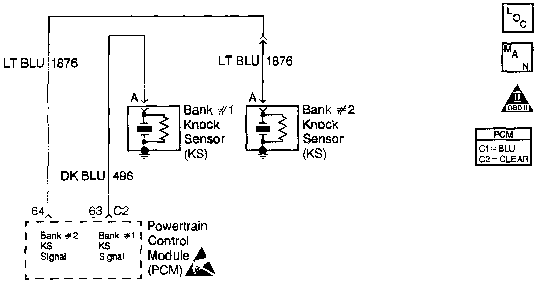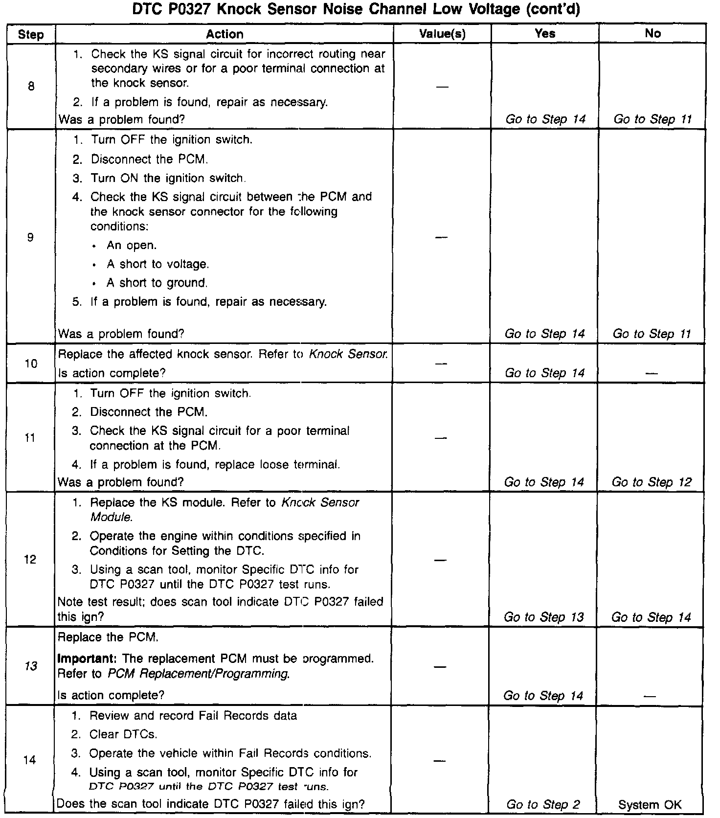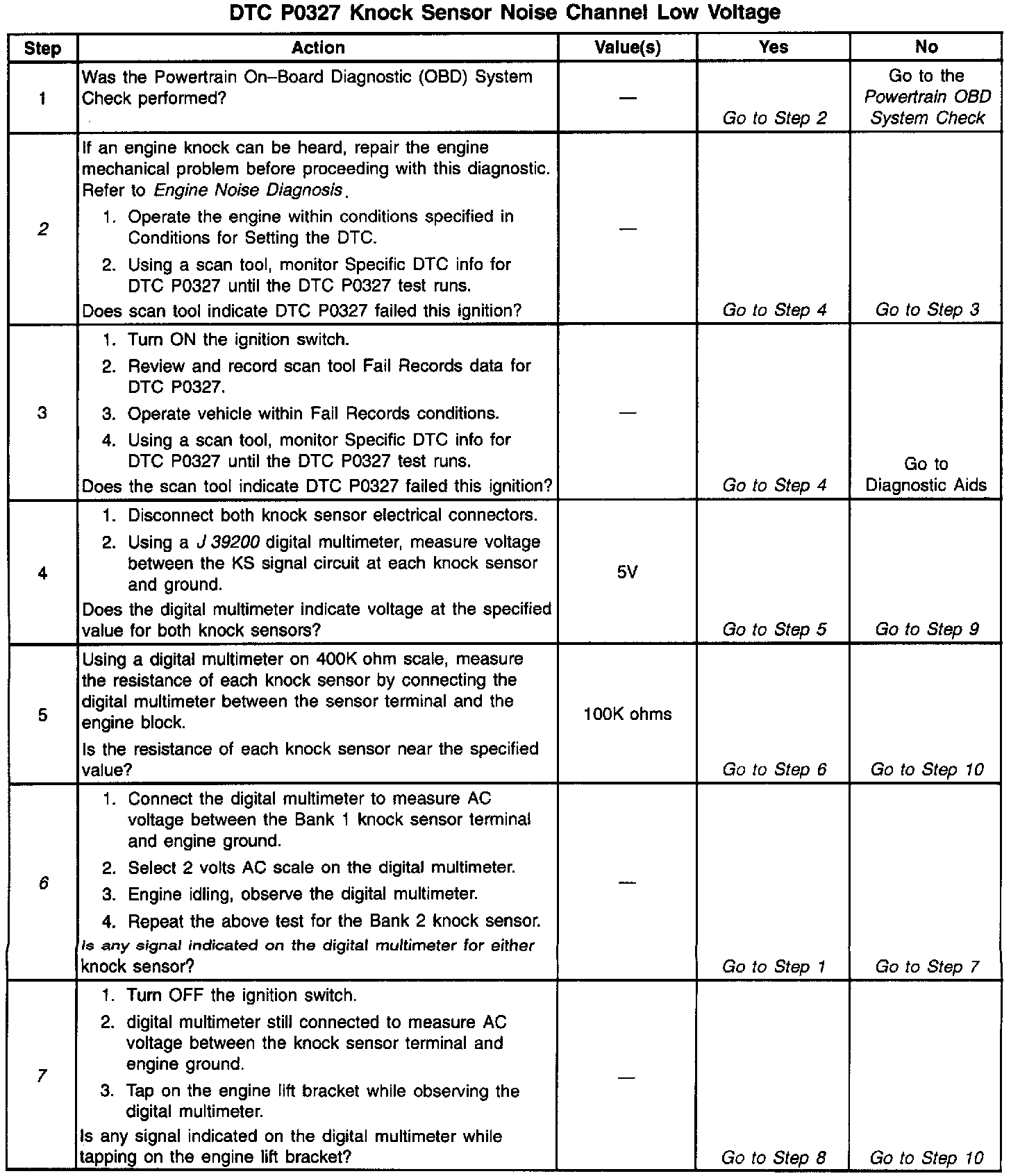 The PCM determines whether the knock sensors and related wiring are operating properly by monitoring the voltage level on the noise channel. The noise channel allows the PCM to diagnose the KS system by allowing the PCM to learn the amount of normal engine mechanical noise present. Normal engine noise varies depending on engine speed and load. When the PCM determines that an abnormally low noise channel voltage level is being experienced, a DTC P0327 will set.