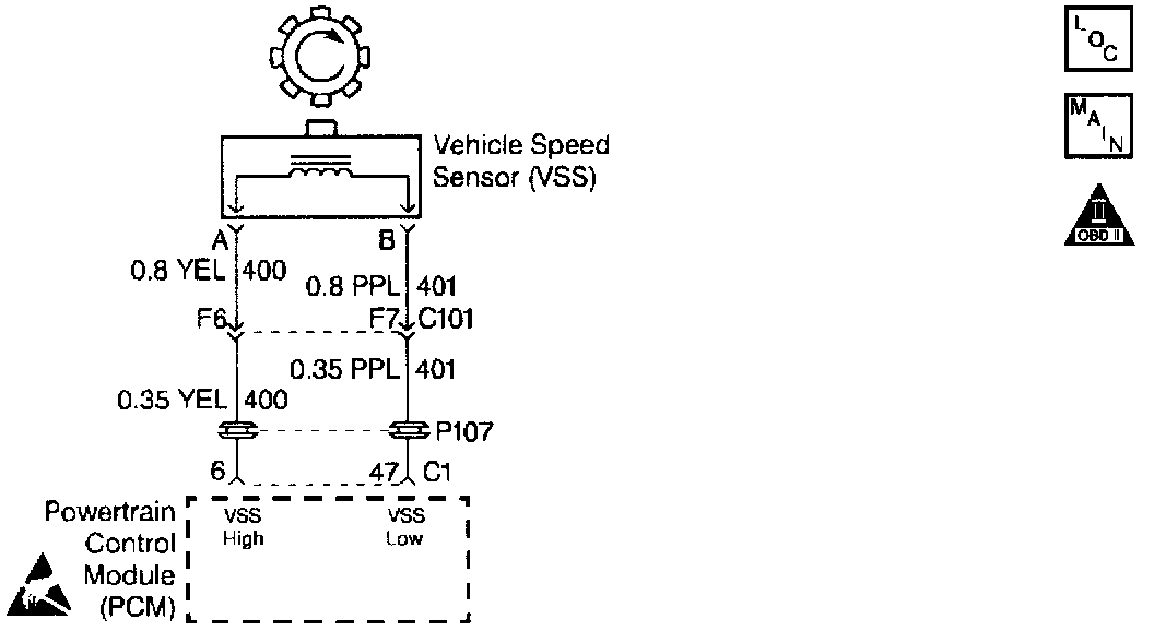 The Vehicle Speed Sensor (VSS) is a Permanent Magnet (PM) generator attached to the transmission case. The final drive assembly has a toothed wheel (VSS rotor). As the final drive assembly rotates, an AC voltage is induced and transmitted to the Powertrain Control Module (PCM). The PCM converts the AC voltage into a digital signal. The PCM uses vehicle speed in order to determine shift timing, TCC apply and release, and gear ratio. The VSS voltage will vary from 0.5 volts AC at 100 RPM to more than 100 volts AC at 6000 RPM. VSS resistance value is 981-1864 ohms.