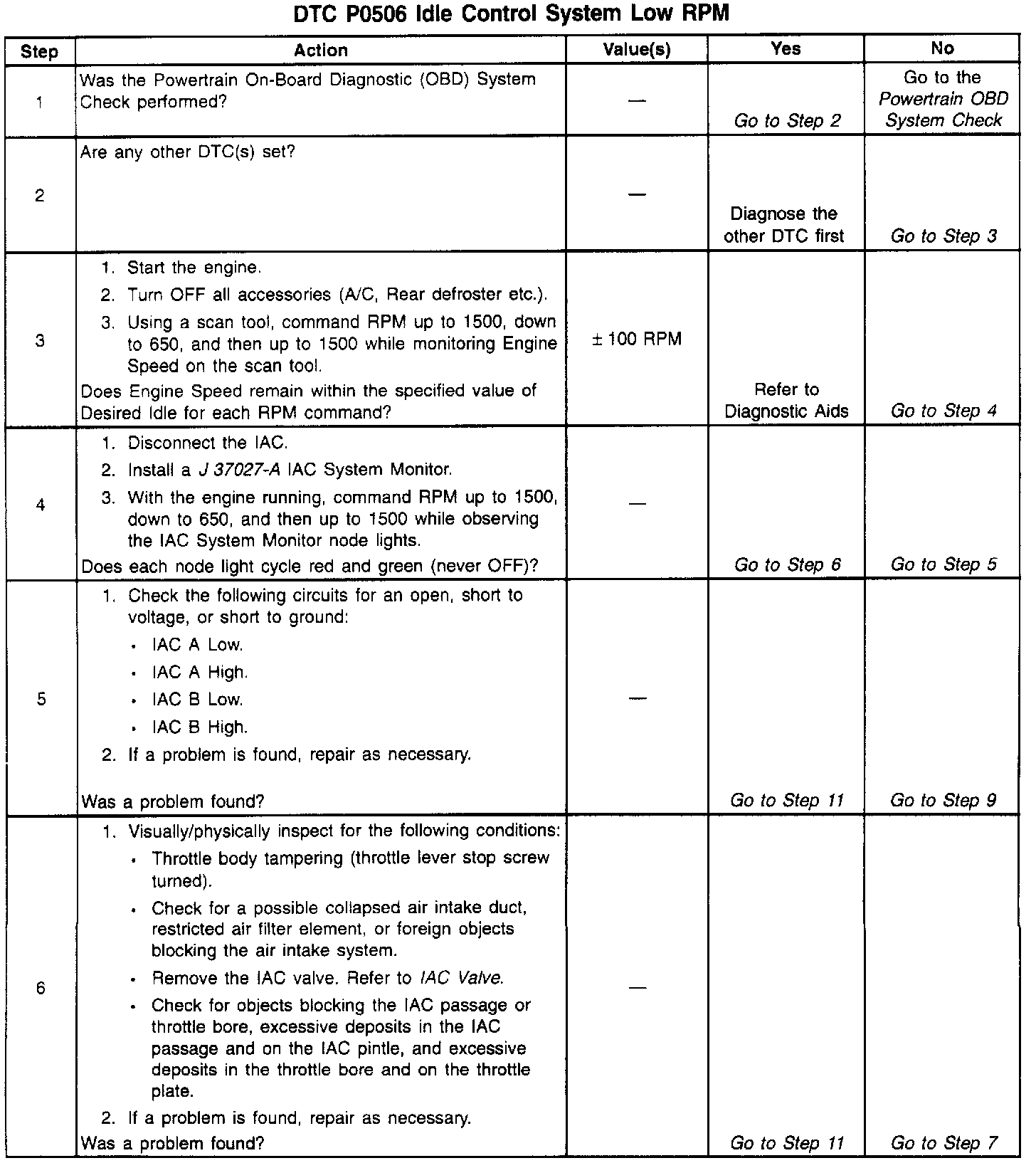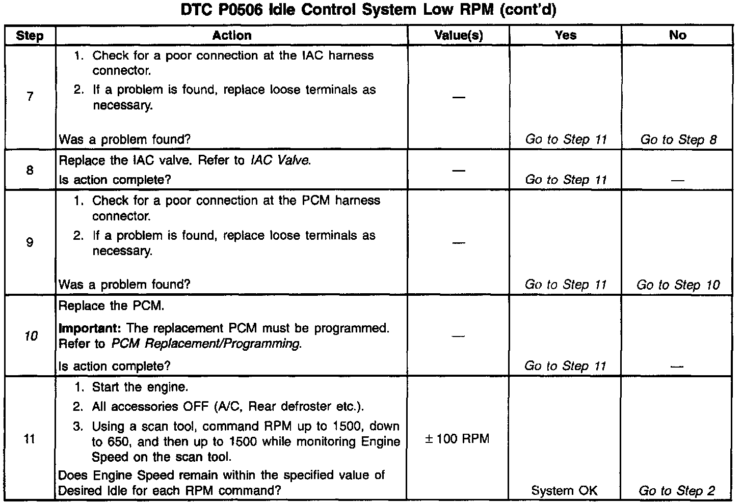 The PCM controls engine idle speed by adjusting the position of the Idle Air Control (IAC) motor pintle. The IAC is a bi-directional motor driven by two coils. The PCM sends pulses (steps) to the IAC to extend or retract the IAC pintle into a passage in the throttle body to decrease or increase airflow. The commanded IAC position (displayed in counts) can be monitored on the scan tool; a higher number of counts indicates more commanded airflow (pintle retracted) This method allows highly accurate control of idle speed and quick response to changes in engine load. If the PCM detects a condition where too low of an idle speed is present and the PCM is unable to adjust idle speed by increasing the IAC counts, DTC P0506 will set indicating a problem with the idle control system.