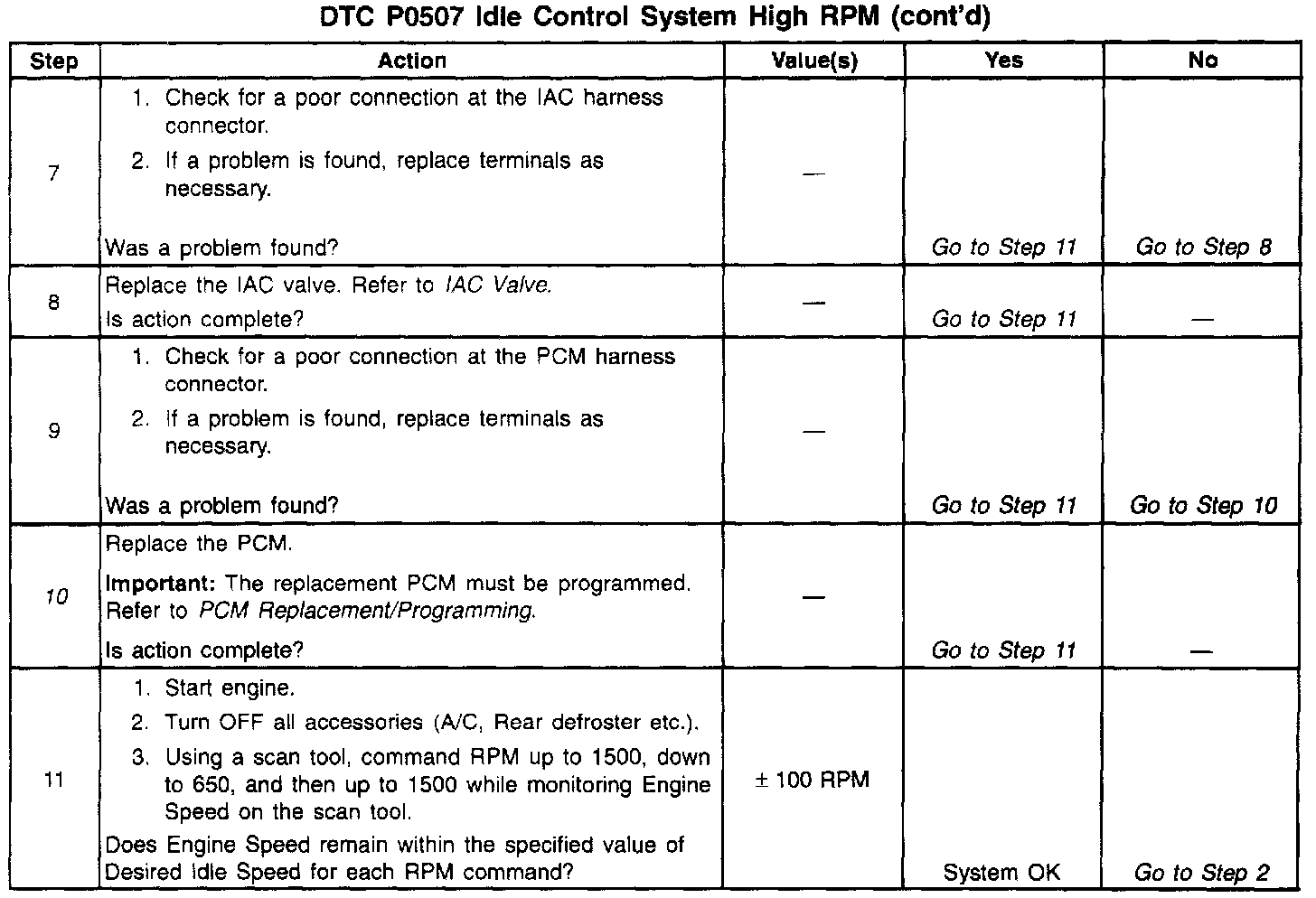 The PCM controls engine idle speed by adjusting the position of the Idle Air Control (IAC) motor pintle. The IAC is a bi-directional motor driven by two coils. The PCM sends pulses (steps) to the IAC to extend or retract the IAC pintle into a passage in the throttle body to decrease or increase air flow. The commanded IAC position (displayed in counts) can be monitored on the scan tool; a lower number of counts indicates less commanded airflow (pintle extended). This method allows highly accurate control of idle speed and quick response to changes in engine load. If the PCM detects a condition where too high of an idle speed is present and the PCM is unable to adjust idle speed by decreasing the IAC counts, DTC P0507 will set indicating a problem with the idle control system.