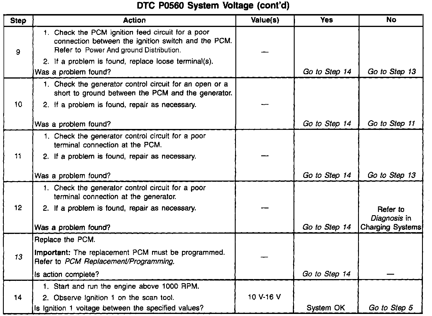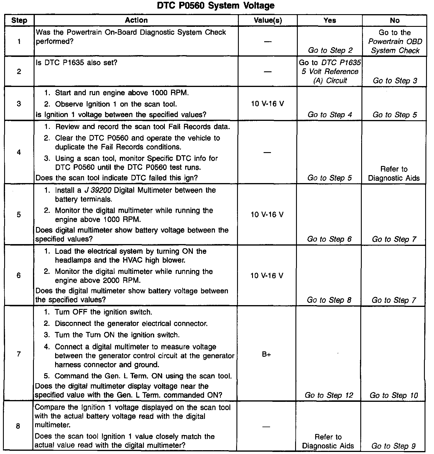 If DTC P0560 cannot be duplicated, reviewing the Fail Records vehicle mileage since the diagnostic test last failed may help determine how often the condition that caused the DTC to be set occurs. This may assist in diagnosing the condition. For complete information and additional diagnostics for the vehicle charging system, refer to Charging System.