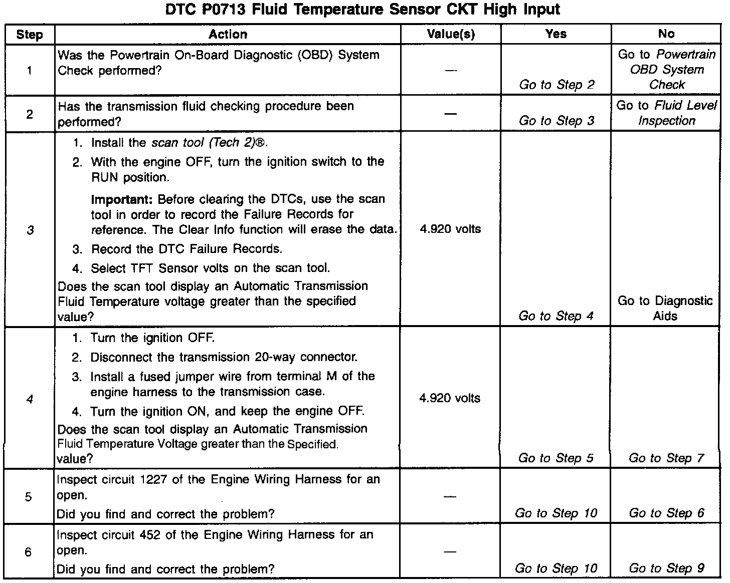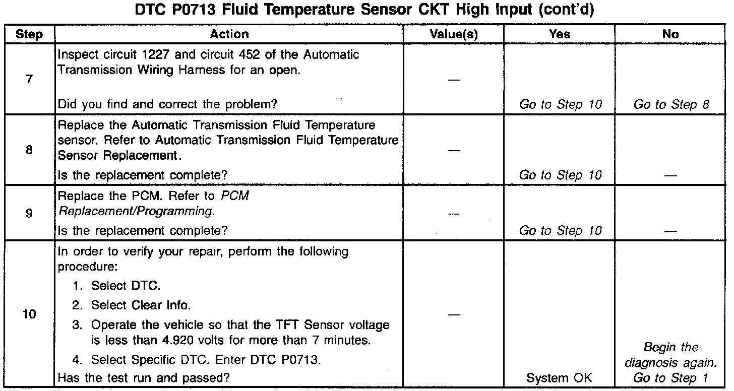 When the PCM detects a continuous open or a short to power on the TFT sensor circuit, then DTC P0713 sets. DTC P0713 is a Type D DTC.