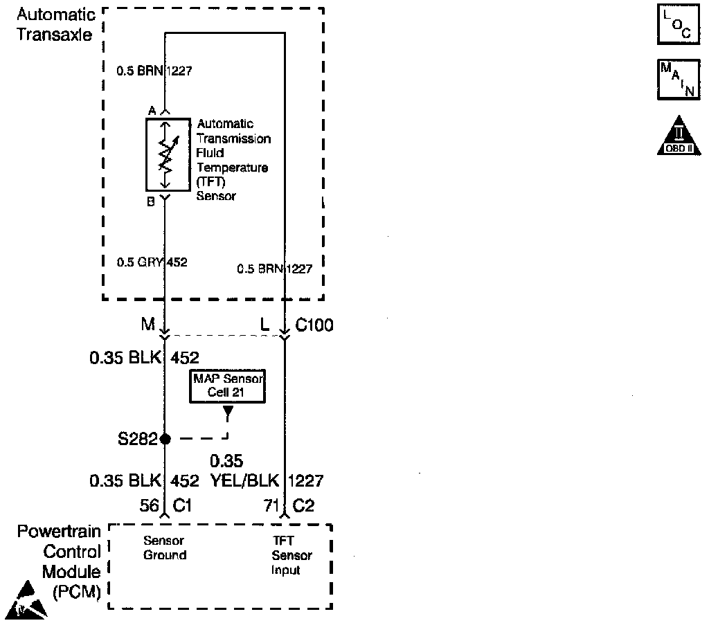 The Automatic Transmission Fluid Temperature (TFT) sensor is a negative coefficient thermistor whose resistance value changes based on temperature. The PCM provides a 5 volt reference to the sensor on circuit 1227. A low fluid temperature or open circuits 1227 or 452 results in high signal voltage. The TFT operating range is -40 to +151°C (-40 to +304°F).