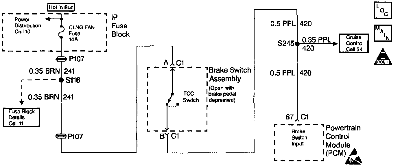 The Torque Converter Clutch (TCC) brake switch reports brake pedal status to the Powertrain Control Module (PCM). The brake switch indicates that the brake pedal is either applied or released. The normally-closed switch supplies battery voltage on circuit 420 to the PCM. Applying the brake pedal opens the brake switch, interrupting voltage to the PCM. When the PCM receives 0 volts at the brake switch input, the PCM turns OFF the TCC Solenoid Valve.