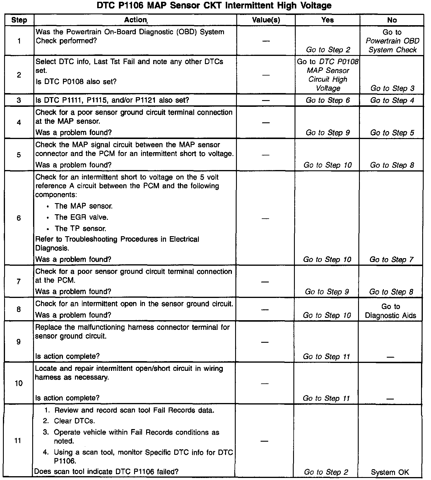 The PCM monitors the MAP signal for voltages outside the normal range of the MAP sensor. If the PCM detects a MAP signal voltage that is intermittently high, DTC P1106 will be set.