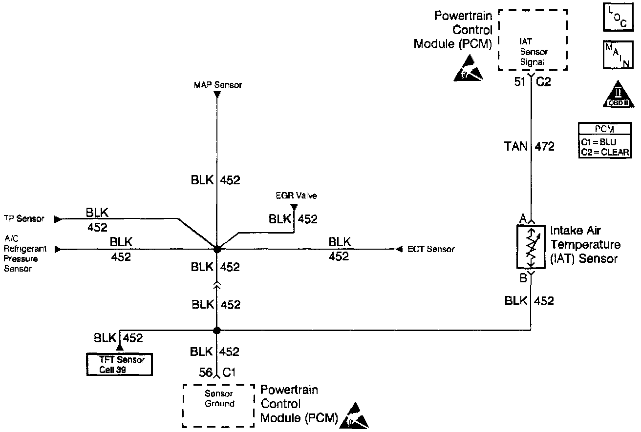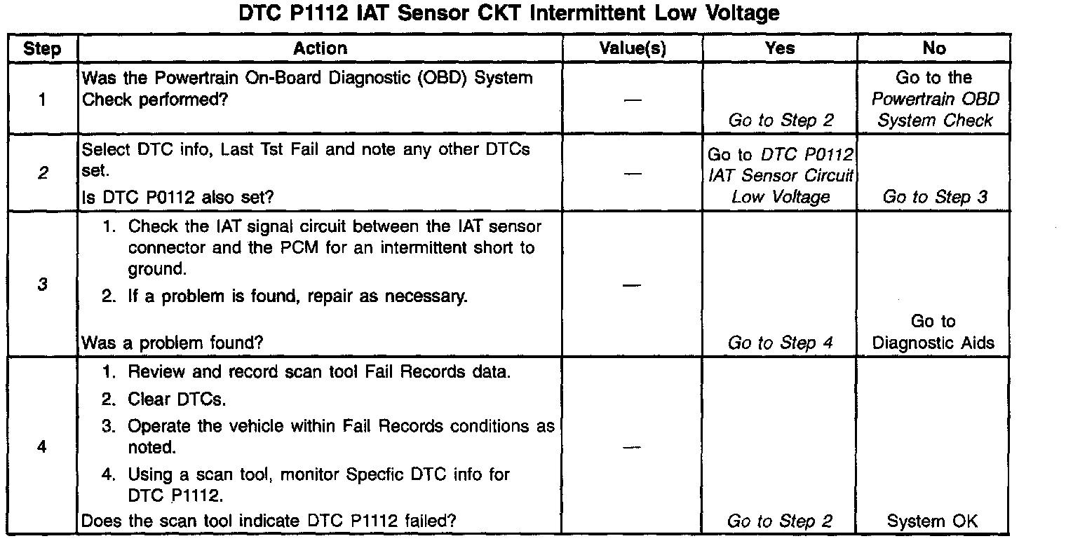 The Intake Air Temperature (IAT) sensor is a thermistor which measures the temperature of the air entering the engine. The PCM applies 5 volts through a pull-up resistor to the IAT sensor. When the intake air is cold, the sensor resistance is high and the PCM will monitor a high signal voltage on the IAT signal circuit. If the intake air is warm, the sensor resistance is lower causing the PCM to monitor a lower voltage. DTC P1112 will set when the PCM detects an intermittently low signal voltage on the intake air temperature sensor signal circuit.