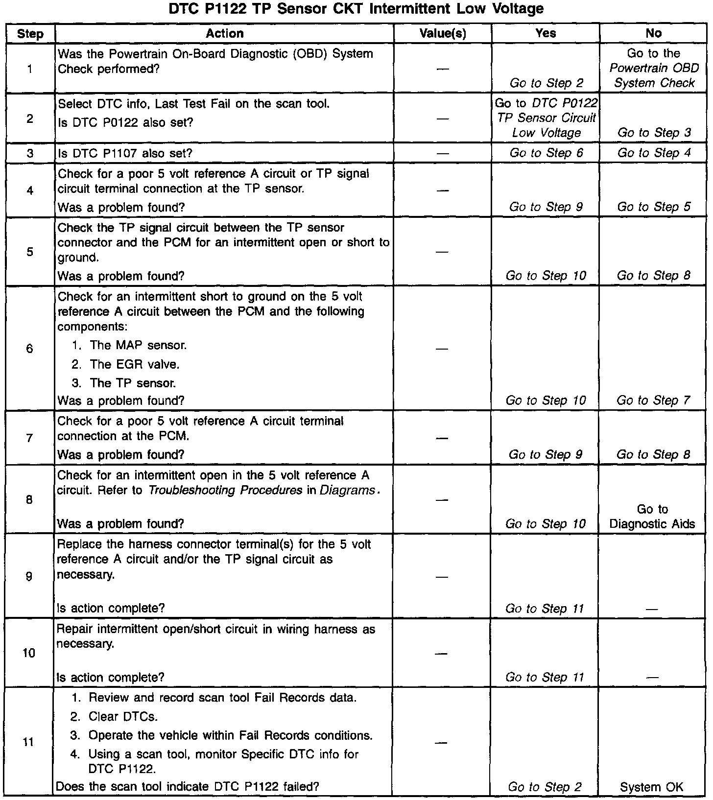 The Throttle Position (TP) sensor circuit provides a voltage signal that changes relative to throttle blade angle. The signal voltage will vary from 1 volt at closed throttle to 4 volts at Wide Open Throttle (WOT). The TP signal is one of the most important inputs used by the PCM for fuel control and most of the PCM-controlled outputs. If the PCM detects a TP signal voltage that is intermittently less than the range of the TP sensor, DTC P1122 will be set.