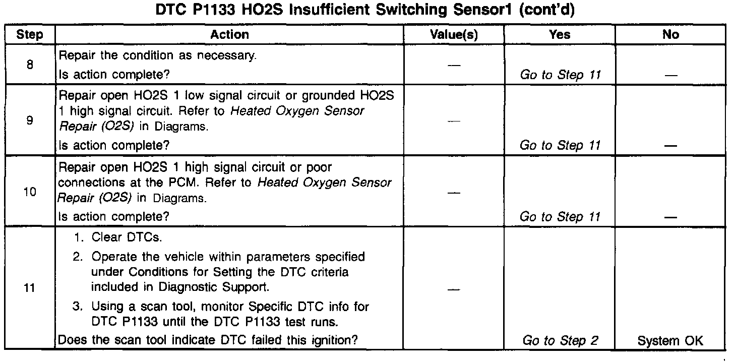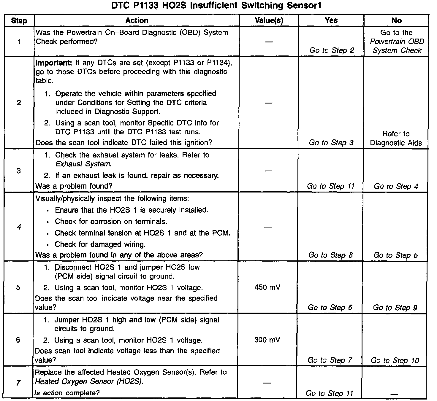 The PCM monitors the Heated Oxygen Sensor (HO2S) activity for 100 seconds. During this test period the PCM counts the number of times that the HO2S signal voltage crosses the rich to lean and lean to rich thresholds. If the PCM determines that the HO2S did not switch enough times, DTC P1133 will be set. A lean to rich switch is determined when the HO2S voltage changes from less than 300 mV to greater than 600 mV. A rich to lean switch is determined when the HO2S voltage changes from more than 600 mV to less than 300 mV.