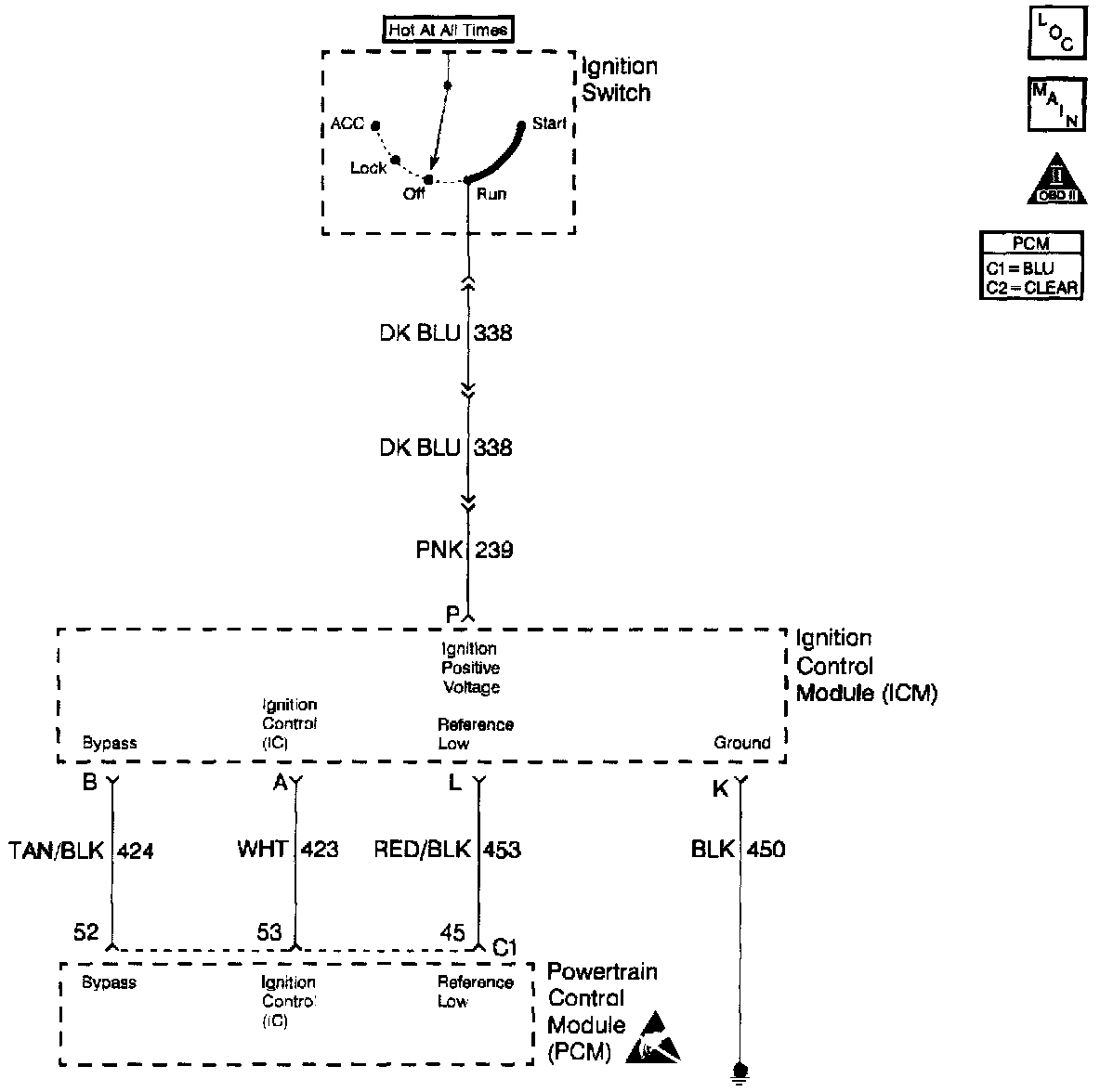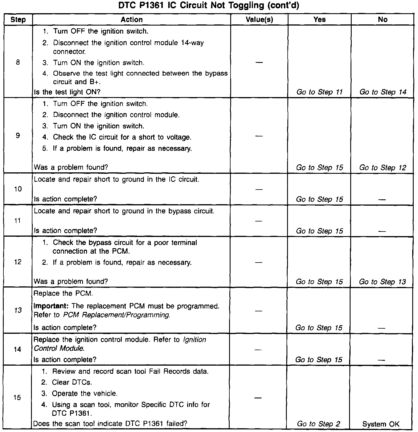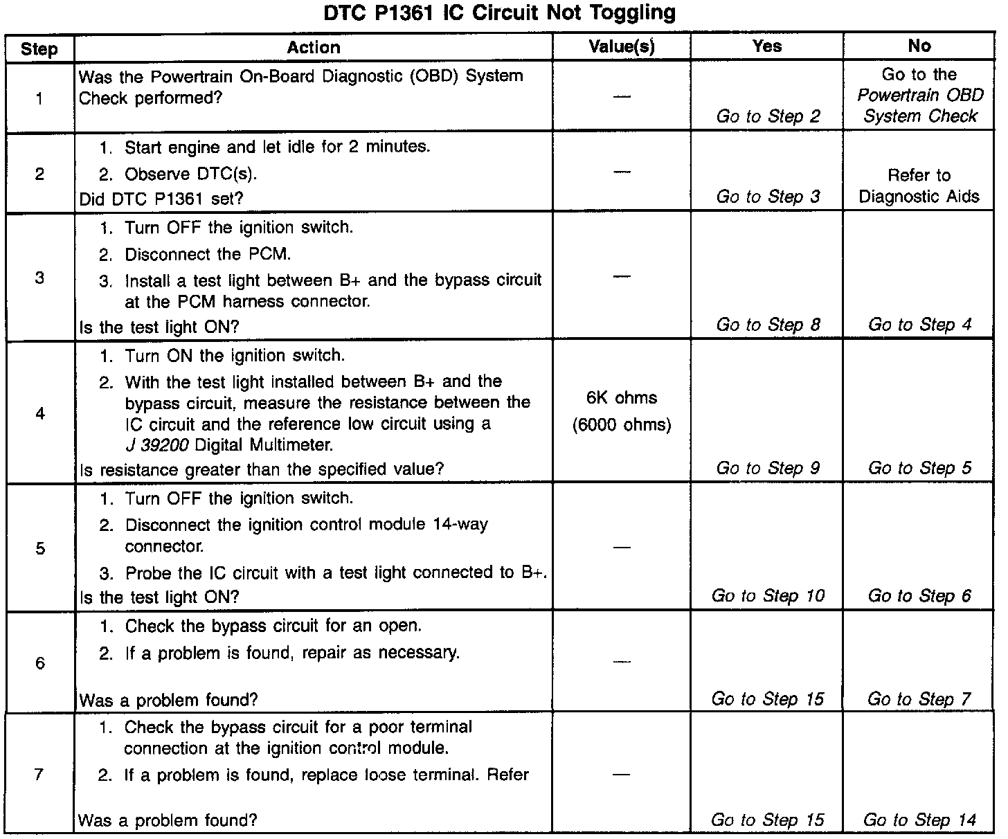 The Ignition Control Module (ICM) sends signals that the PCM requires for fuel control and spark advance calculations. At the start of engine crank, the ICM controls spark advance (Bypass mode). When the second 3X reference pulse is recognized by the PCM, the PCM applies 5 volts to the Bypass circuit. The 5 volts on the Bypass circuit commands the ICM to switch spark advance to PCM control (IC mode). At this time, The ICM will remove the ground it has applied to the IC circuit. When the IC pulses are not grounded, the ICM can use the IC pulses to control spark advance. A short in the IC circuit or an open or short to ground in the Bypass circuit will cause the PCM to monitor no IC pulses after the PCM has switched the Bypass circuit ON. The PCM will set DTC P1361 under either of these conditions. The engine may be started but will run on Bypass mode timing.