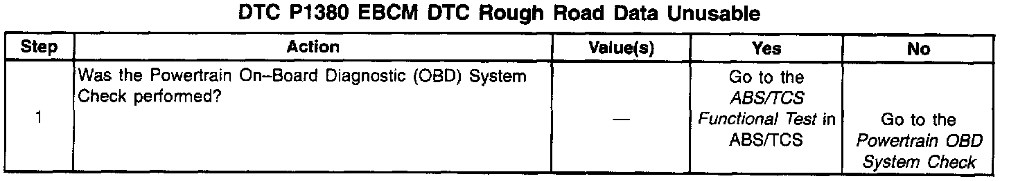 DTC P1380 set indicates that the ABS / TCS system has detected a malfunction which will not allow the EBCM / EBTCM to transmit correct rough road data to the PCM. The Diagnostic System Check in ABS Brakes should be used to diagnose this condition.