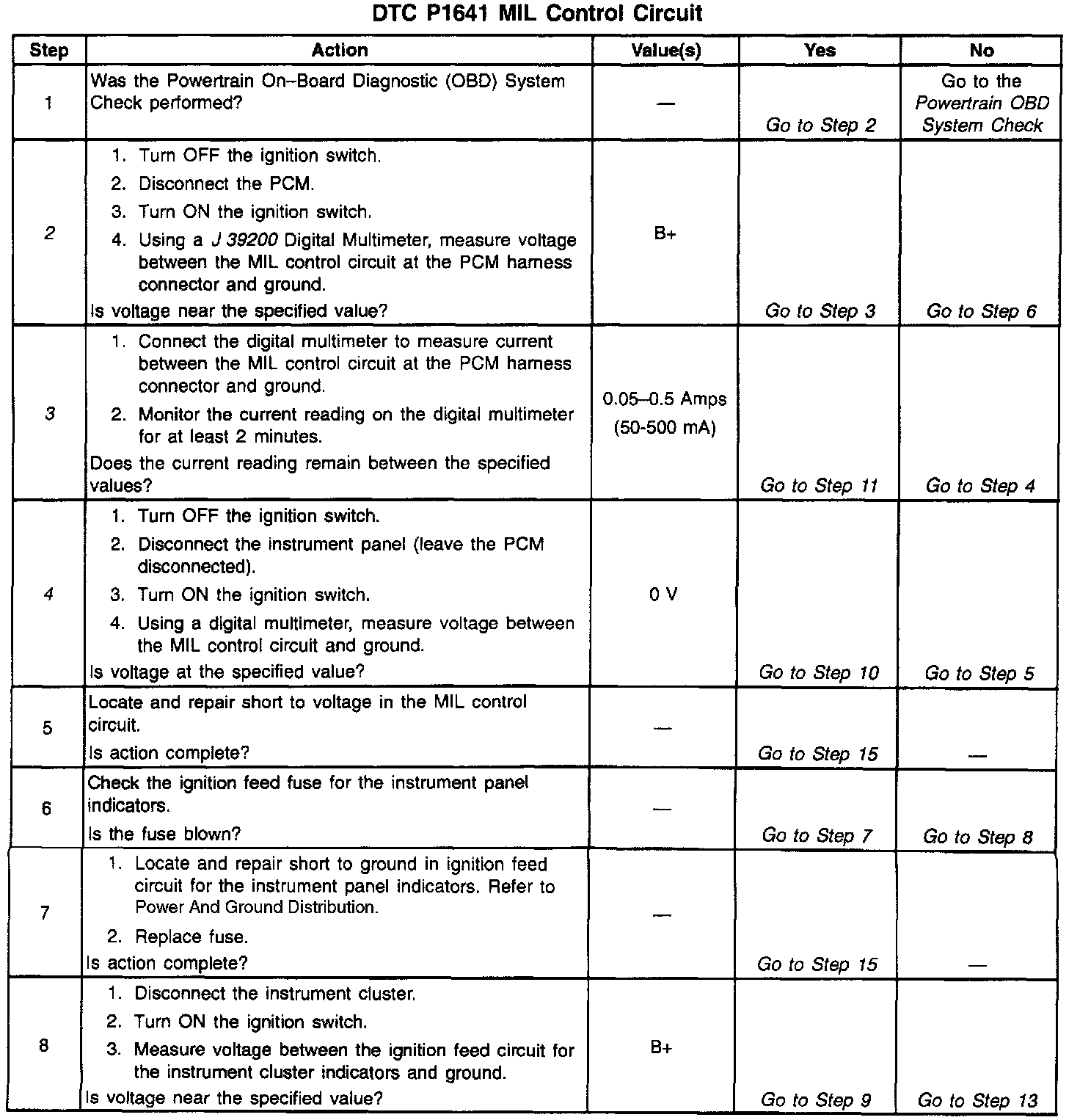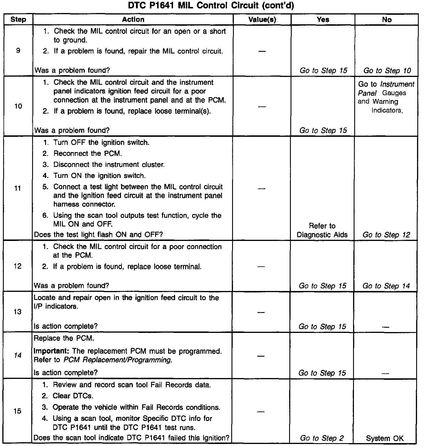 ^ The PCM will not illuminate the Malfunction Indicator Lamp (MIL). If the MIL control circuit is shorted to ground, the MIL will be illuminated at all times and DTC P1641 will set.