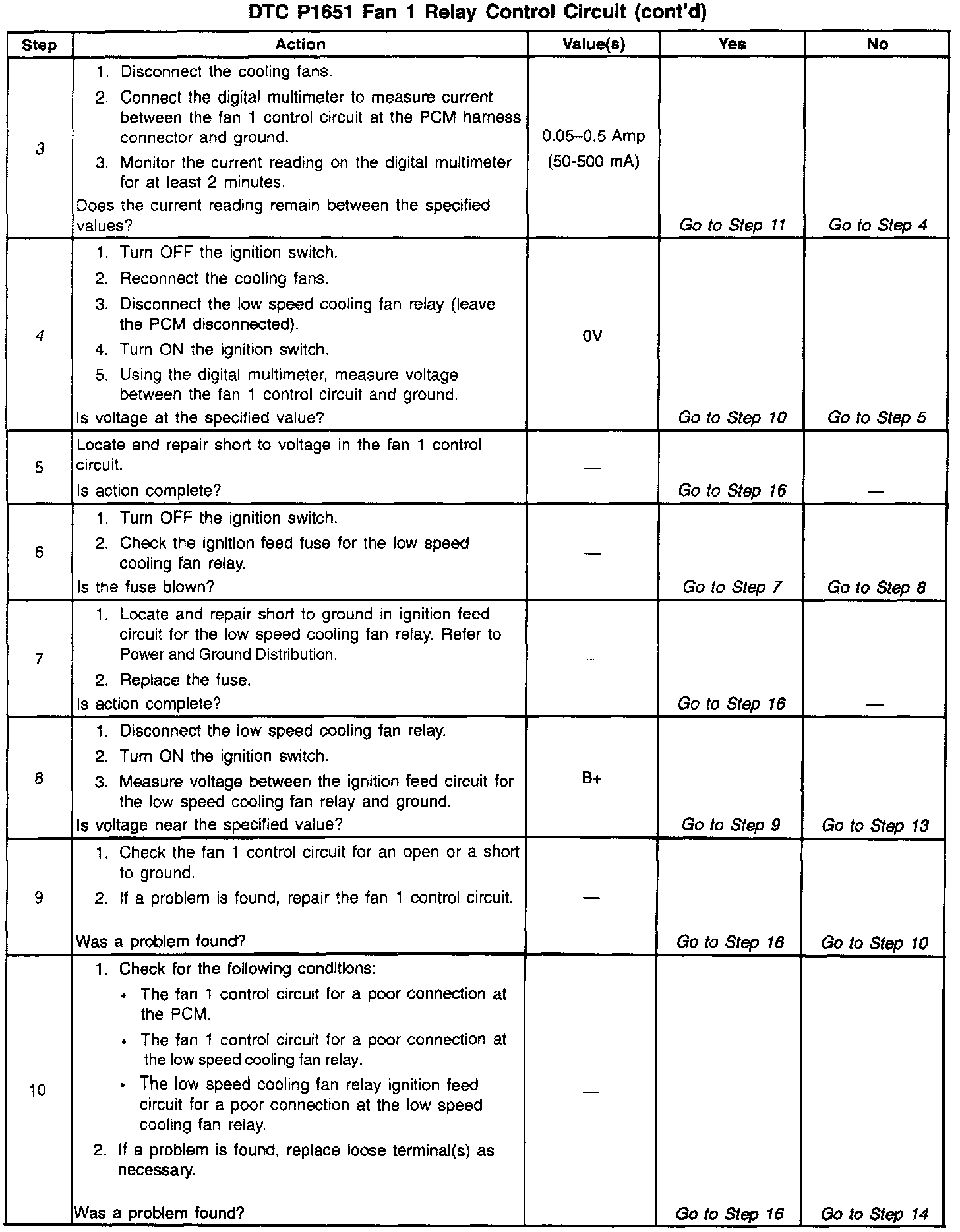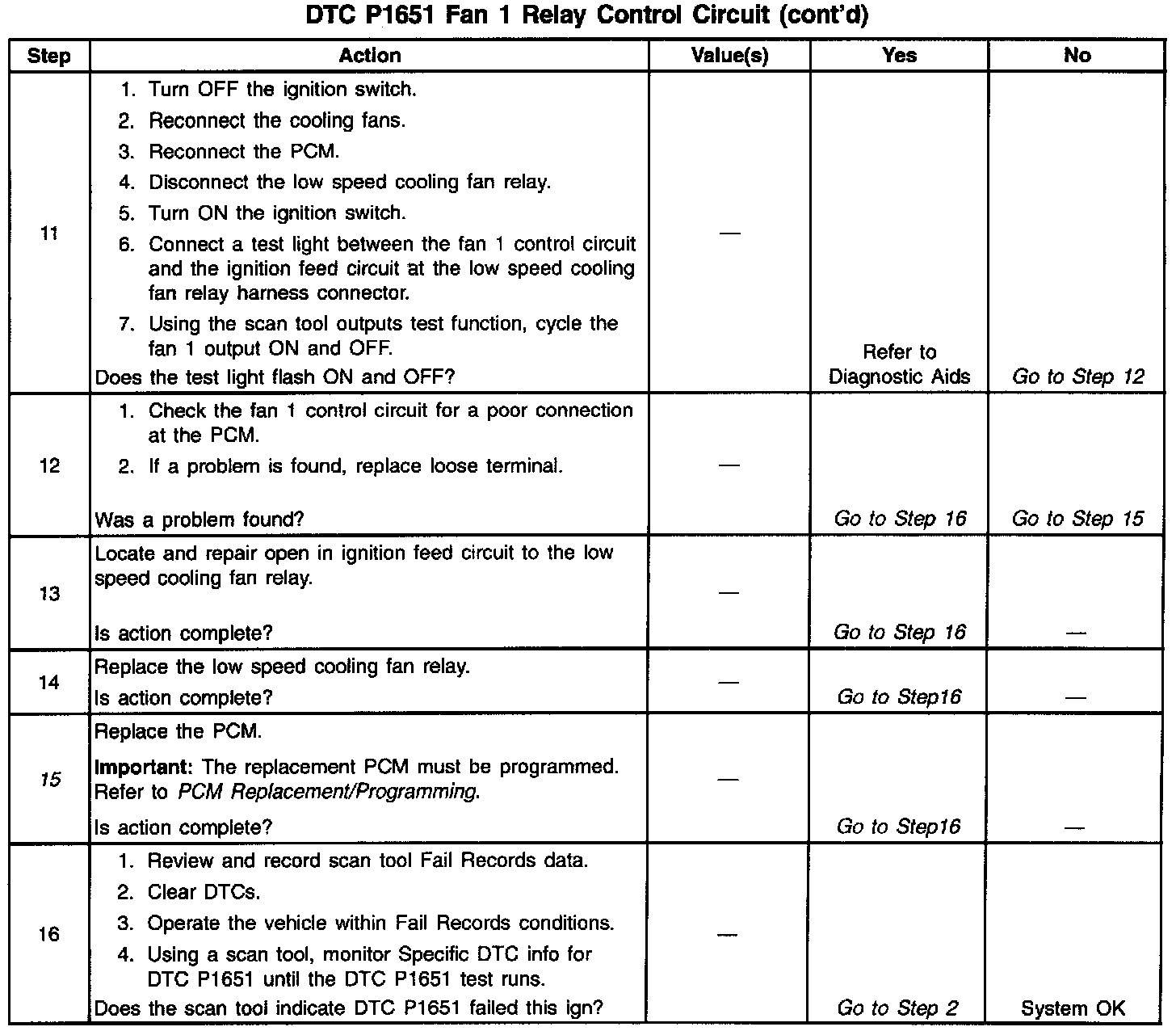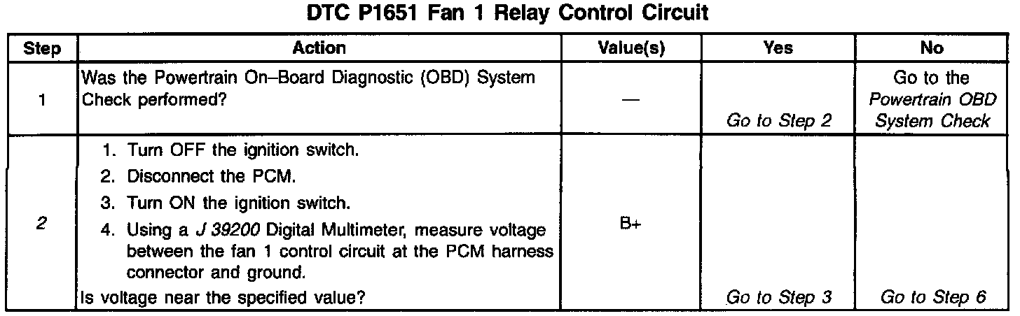 Output Driver Modules (ODMs) are used by the PCM to turn on many of the current-driven devices that are needed to control various engine and Transaxle functions. Each ODM is capable of controlling up to 7 separate outputs by applying ground to the device which the PCM is commanding ON. Unlike the Quad Driver Modules (QDMs) used in prior model years, ODMs have the capability of diagnosing each output circuit individually. DTC P1651 set indicates an improper voltage level has been detected on the Fan 1 control circuit, which controls the low speed cooling fans relay.