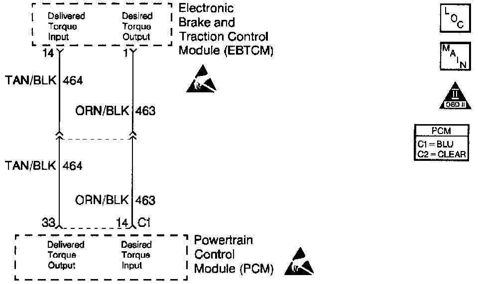 The Electronic Brake and Traction Control Module (EBTCM) controls the Pulse Width Modulation (PWM) signal on the Desired Torque circuit while monitoring the wheel speed sensors to detect slippage. The PCM monitors the PWM signal and reduces engine torque as needed by retarding ignition timing, decreasing boost duty cycle, increasing air/fuel ratio, or, in severe cases, shutting OFF up to three fuel injectors. The PCM sends a PWM signal to the Electronic Brake and Traction Control Module (EBTCM) on the delivered torque circuit informing the EBTCM of response made to the desired torque signal. A problem with the delivered torque circuit should cause DTC P1653 to set and traction control to be disabled. Refer to ABS/TCS for further information.