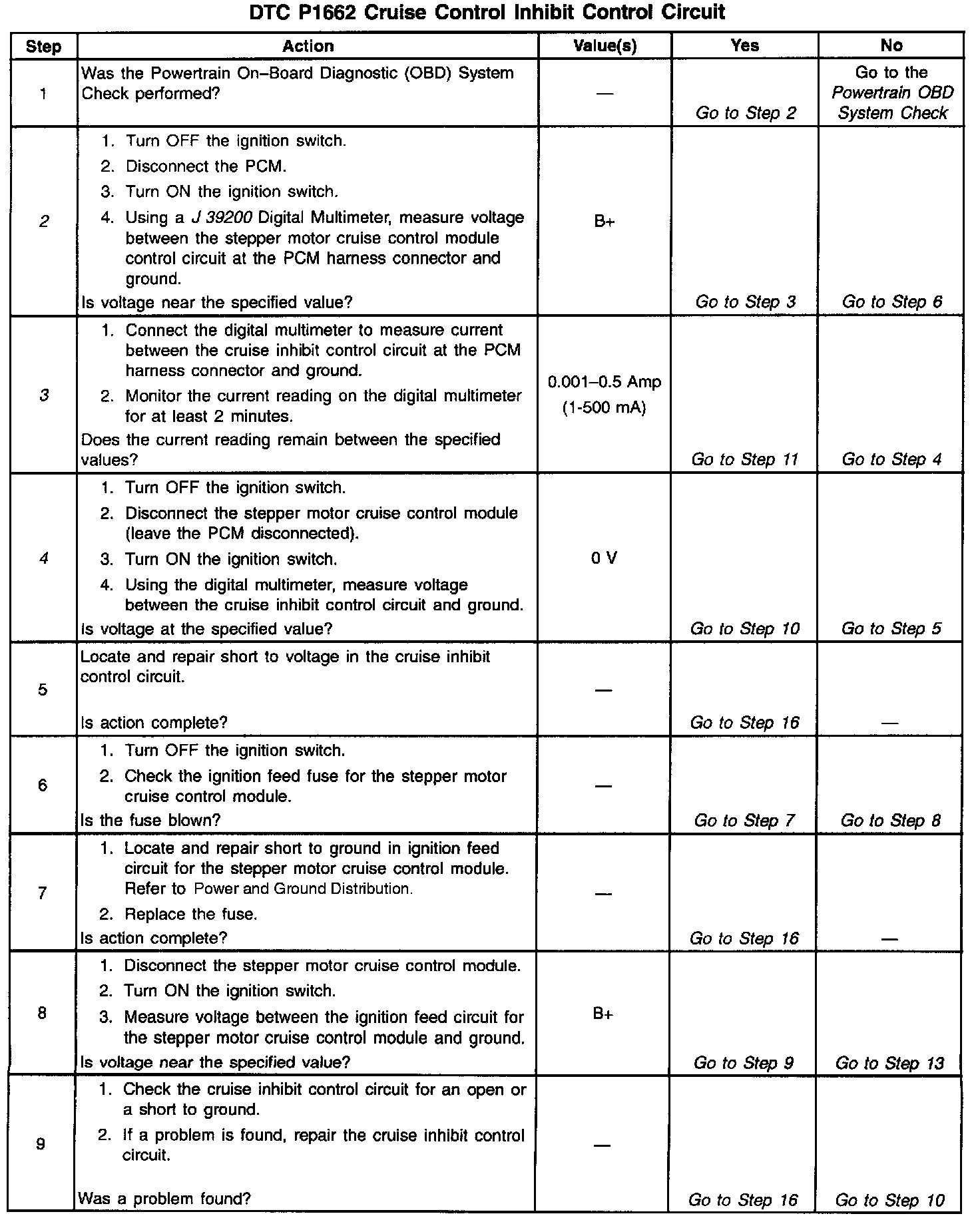 Output Driver Modules (ODMs) are used by the PCM to turn on many of the Current-driven devices that are needed to control various engine and Transaxle functions. Each ODM is capable of controlling up to 7 separate outputs by applying ground to the device which the PCM is commanding ON. Unlike the Quad Driver Modules (QDMs) used in prior model years, ODMs have the capability of diagnosing each output circuit individually. DTC P1662 set indicates an improper voltage level has been detected on the stepper motor cruise control inhibit control circuit.