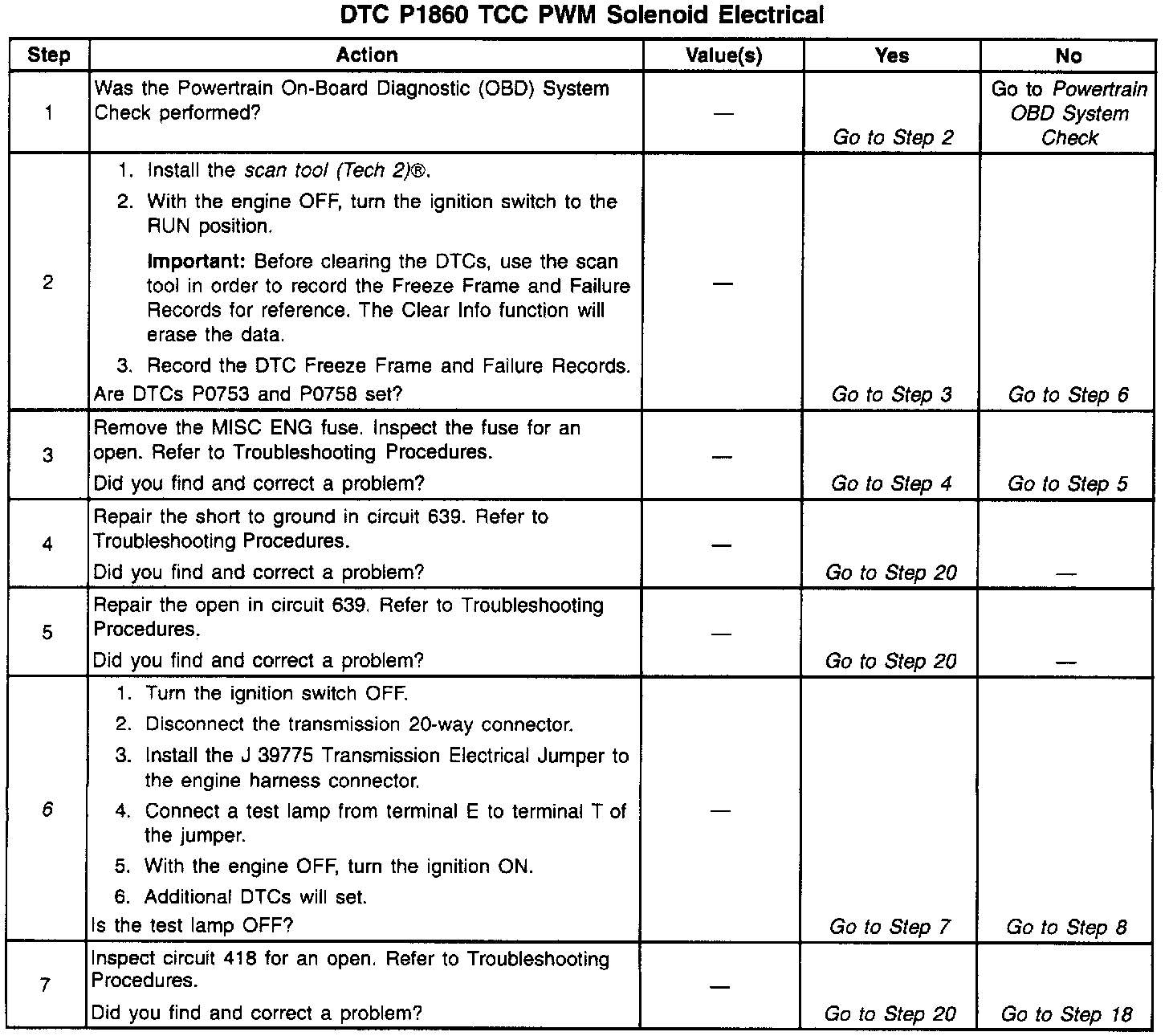 The Torque Converter Clutch Pulse Width Modulation Solenoid Valve (TCC PWM Sol. Valve) controls the fluid acting on the converter clutch valve. The clutch valve controls the application and the release of the TCC. When you command the TCC PWM Sol. Valve OFF, the Powertrain Control Module (PCM) receives high voltage. When you command the TCC PWM Sol. Valve ON, the PCM receives low voltage. DTC P1860 sets anytime the received voltage is outside of the calibration limits. DTC P1860 is a type A DTC.