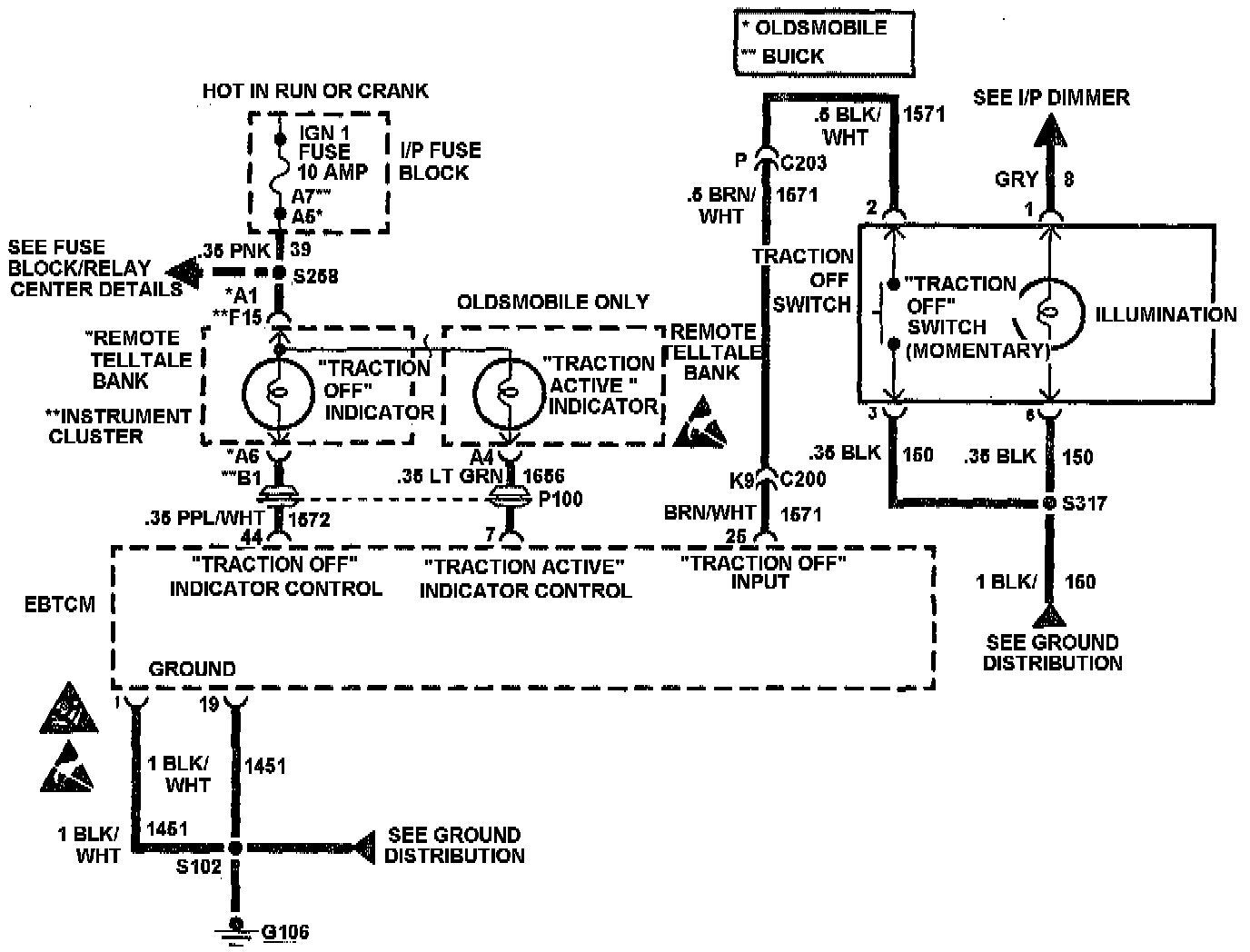 When the ignition is first turned to RUN, the Electronic Brake/Traction Control Module (EBCM/EBTCM) goes through a self-test. During this test, the EBCM grounds both the ANTILOCK and TRACTION OFF indicators for approximately 2 to 4 seconds. This acts as a bulb test for the indicators.