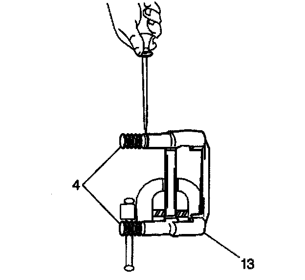 4. Bushings from anchor bracket mounting bores. Use a screwdriver or punch to bend bushings inward and extract bushings with needle nose pliers. Clean All parts in clean, denatured alcohol. Dry with unlubricated compressed air. Inspect Caliper anchor bracket for cracks. If cracked, replace bracket.