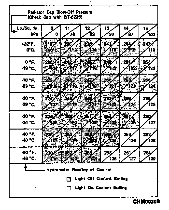 WARNING: As long as there is pressure in the cooling system, the temperature can be considerably higher than the boiling temperature of the Solution in the radiator without causing the solution to boil. Removal of the radiator cap while the engine is hot and pressure is high will cause the solution to boil instantaneously possibly with explosive force spewing the solution over engine, fenders, and person removing cap. Under some conditions, the ethylene glycol in engine coolant is combustible.