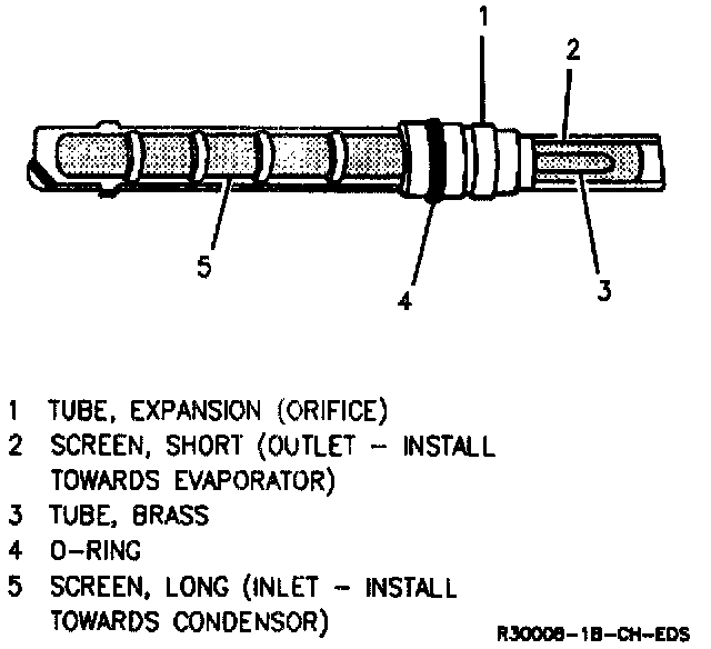 The expansion tube consists of a small brass tube (the orifice) molded into a plastic holder, with fine mesh screening protecting both ends of the tube. The expansion tube is installed inside the evaporator inlet refrigerant line where it connects to the condenser outlet. The expansion tube is serviced as an assembly by replacement only.
