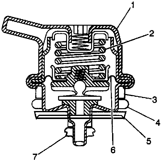 The cartridge type fuel pressure regulator (1) is a diaphragm-operated relief valve (6) with fuel pump pressure on one side, and regulator spring (2) pressure, and intake manifold vacuum on the other side. The regulators function is to maintain a constant fuel pressure across the injectors at all times. The pressure regulator compensates for engine load by increasing fuel pressure as engine vacuum drops.