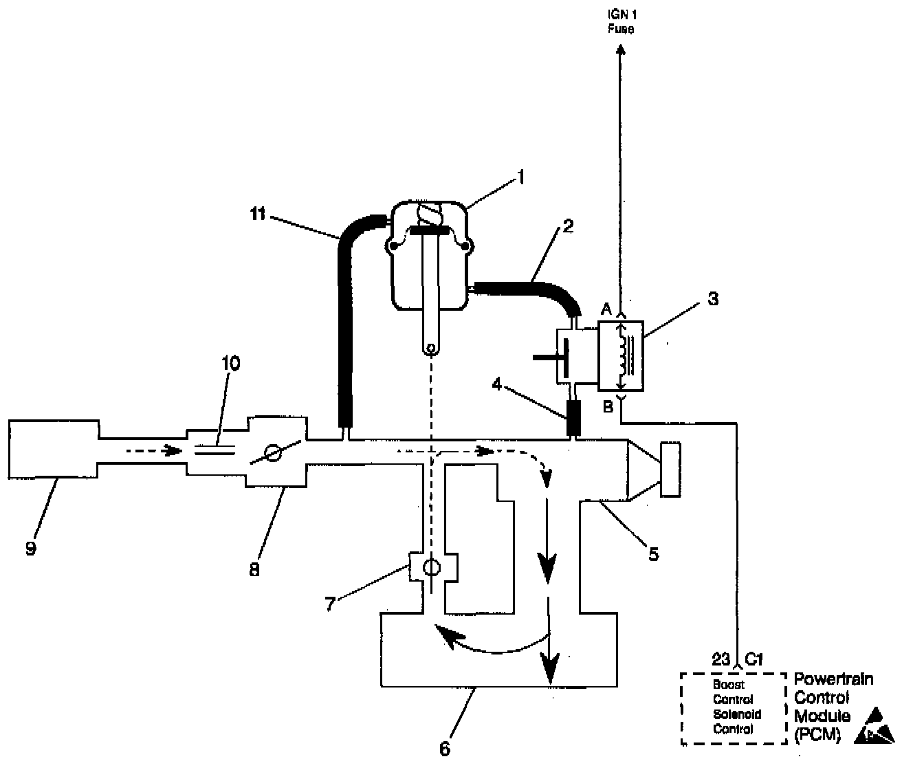 Under most conditions, the Powertrain Control Module (PCM) commands the boost control solenoid to operate at a 100% duty cycle (ON), keeping the solenoid valve closed and allowing only inlet vacuum to control the position of the bypass valve. At idle, full inlet vacuum applied to one side of the bypass valve actuator diaphragm counteracts spring tension to hold bypass valve open. As engine load increases, reduced vacuum acts upon the spring tension in the bypass valve actuator, causing the bypass valve to close and increasing boost pressure.